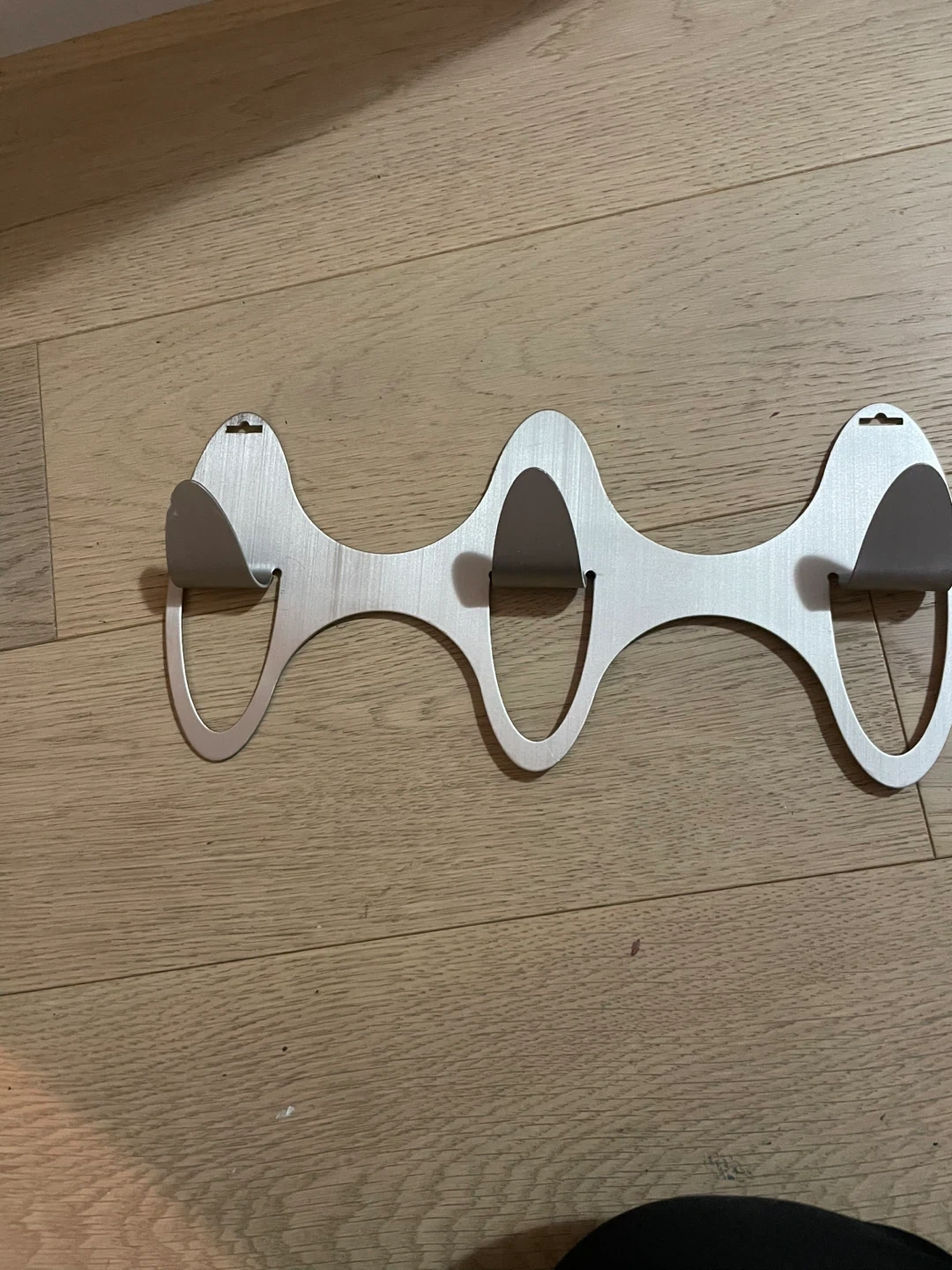 This Umbra wall rack offers three sturdy hooks for hanging coats, bags, or other accessories. It's made from metal with a brushed finish and includes black felt pads on each hook to protect your items. Easy to install, it's great for entryways or closets!