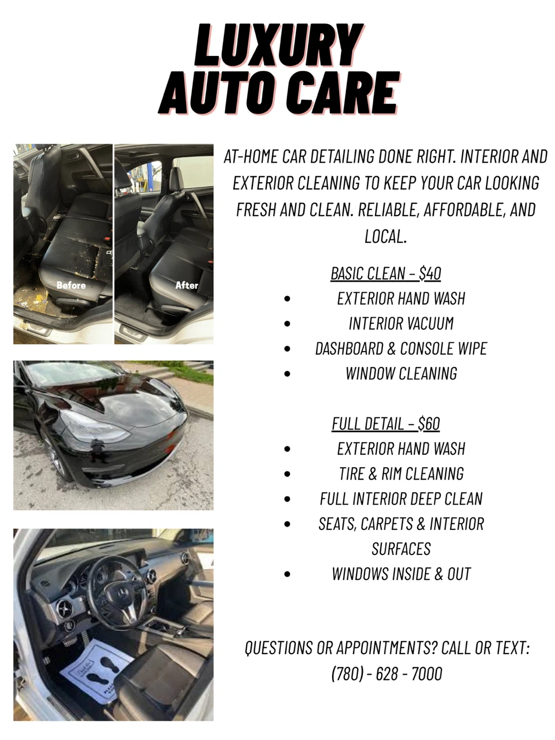 At-home car detailing done right, keeping your car looking fresh and clean. Services include exterior hand wash, interior vacuum, and dashboard wipe for a basic clean. Full detail also offers tire & rim cleaning, deep interior clean for seats, carpets, and all surfaces, plus windows inside and out.