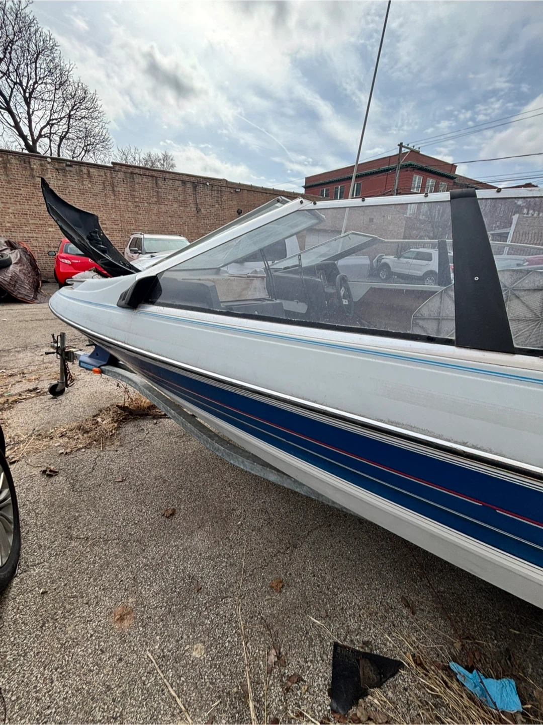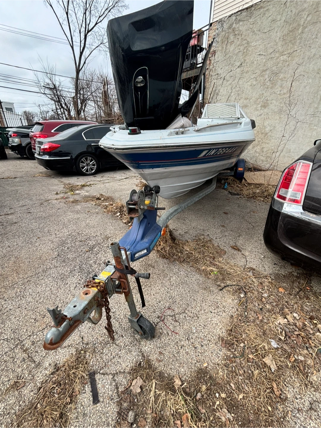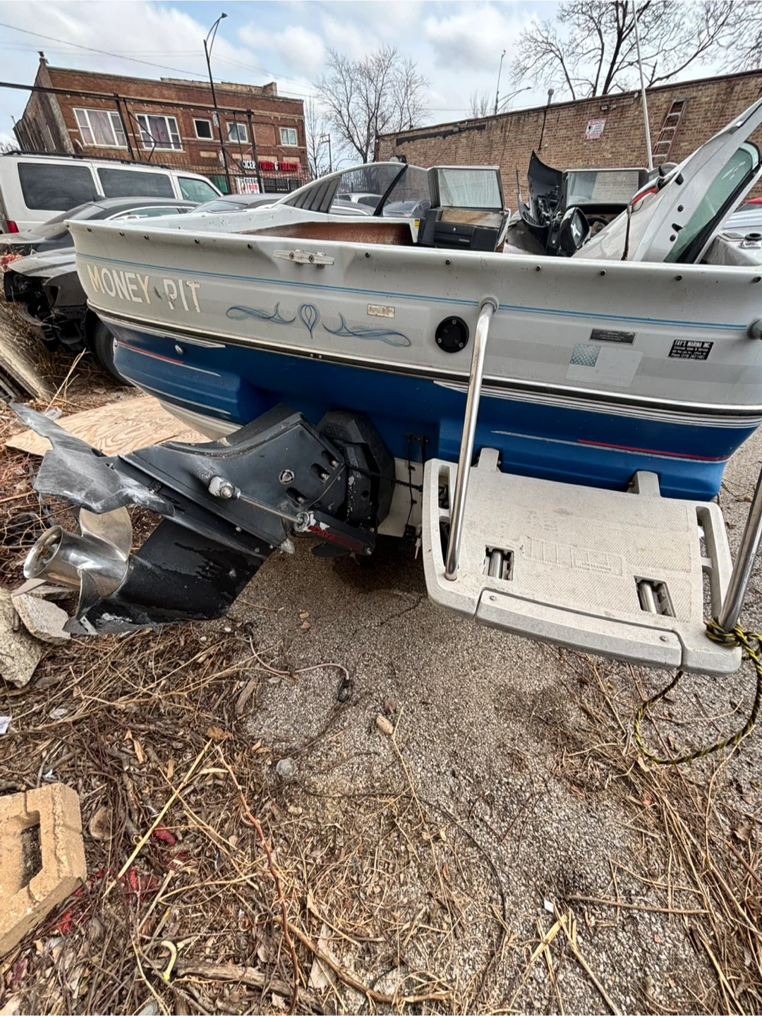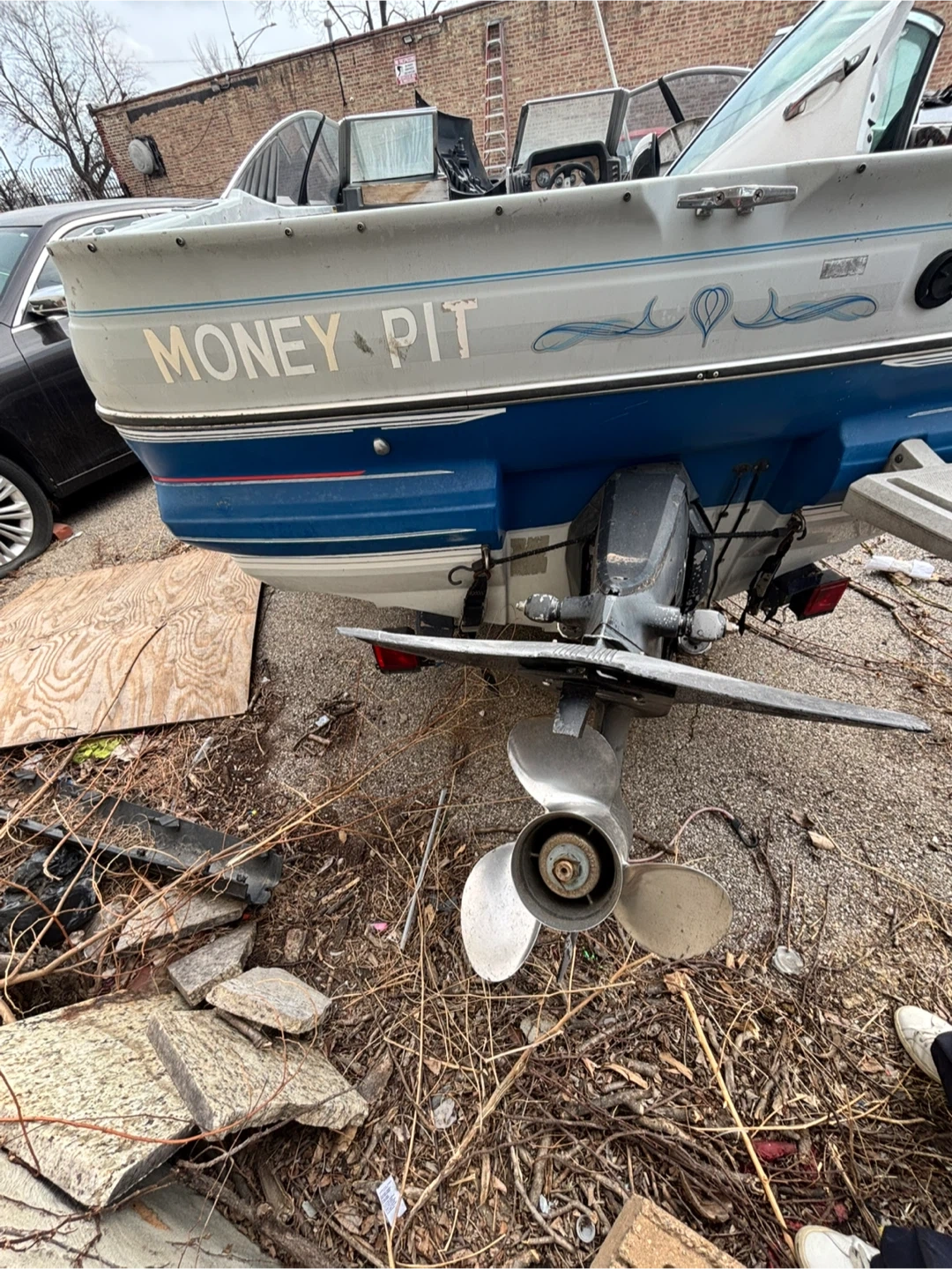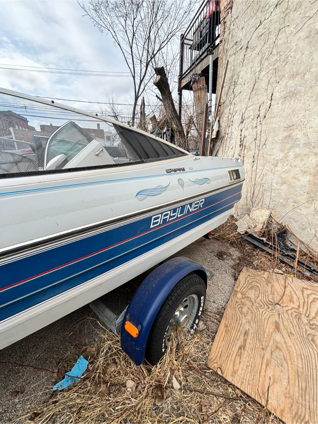 This is a Bayliner Capri boat, model 170. It comes on a trailer. You take both the boat project and the trailer. The exterior has blue and red accents. The boat's name is 'MONEY PIT'.