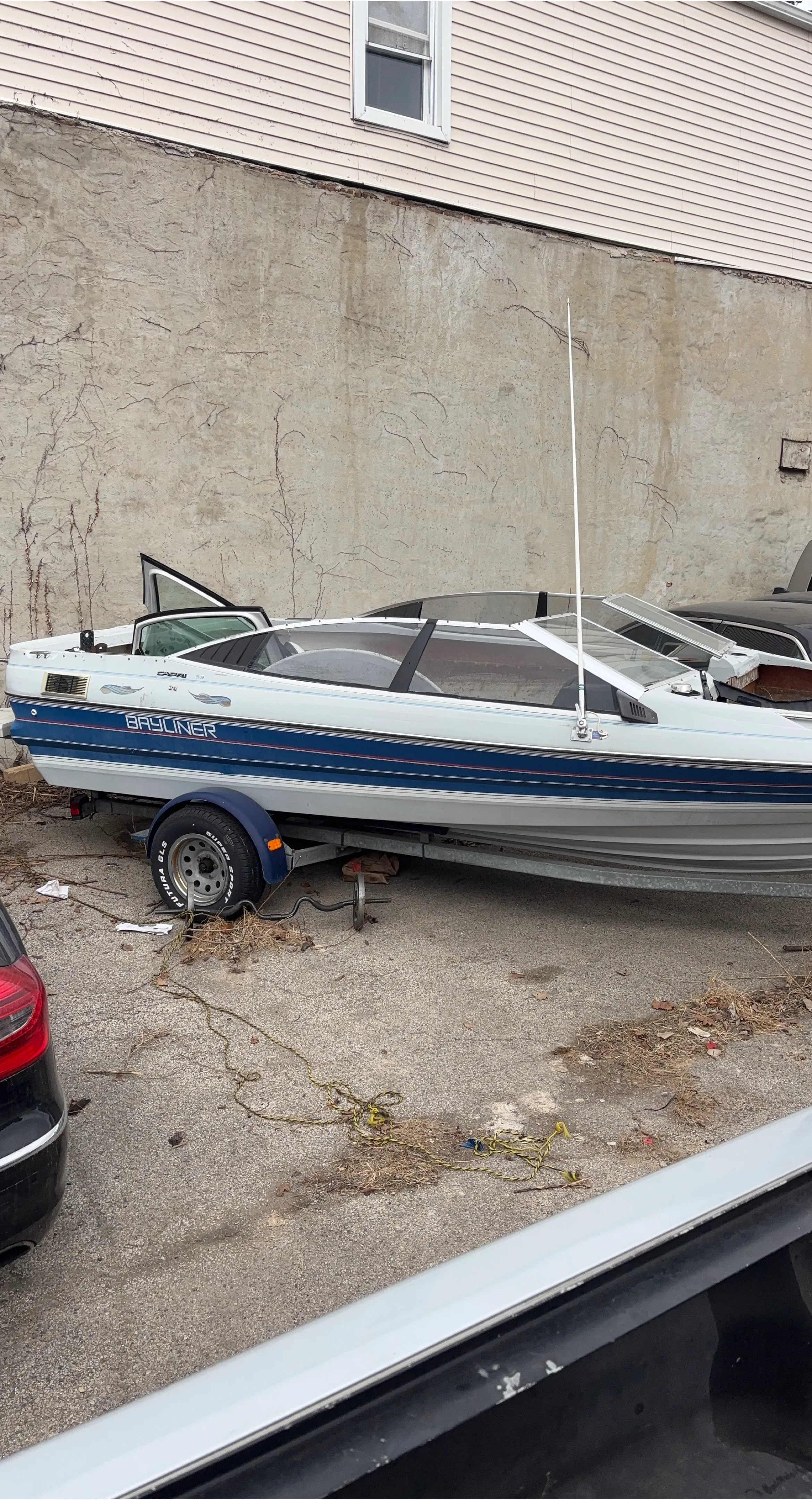 This is a Bayliner Capri boat, model 170. It comes on a trailer. You take both the boat project and the trailer. The exterior has blue and red accents. The boat's name is 'MONEY PIT'.