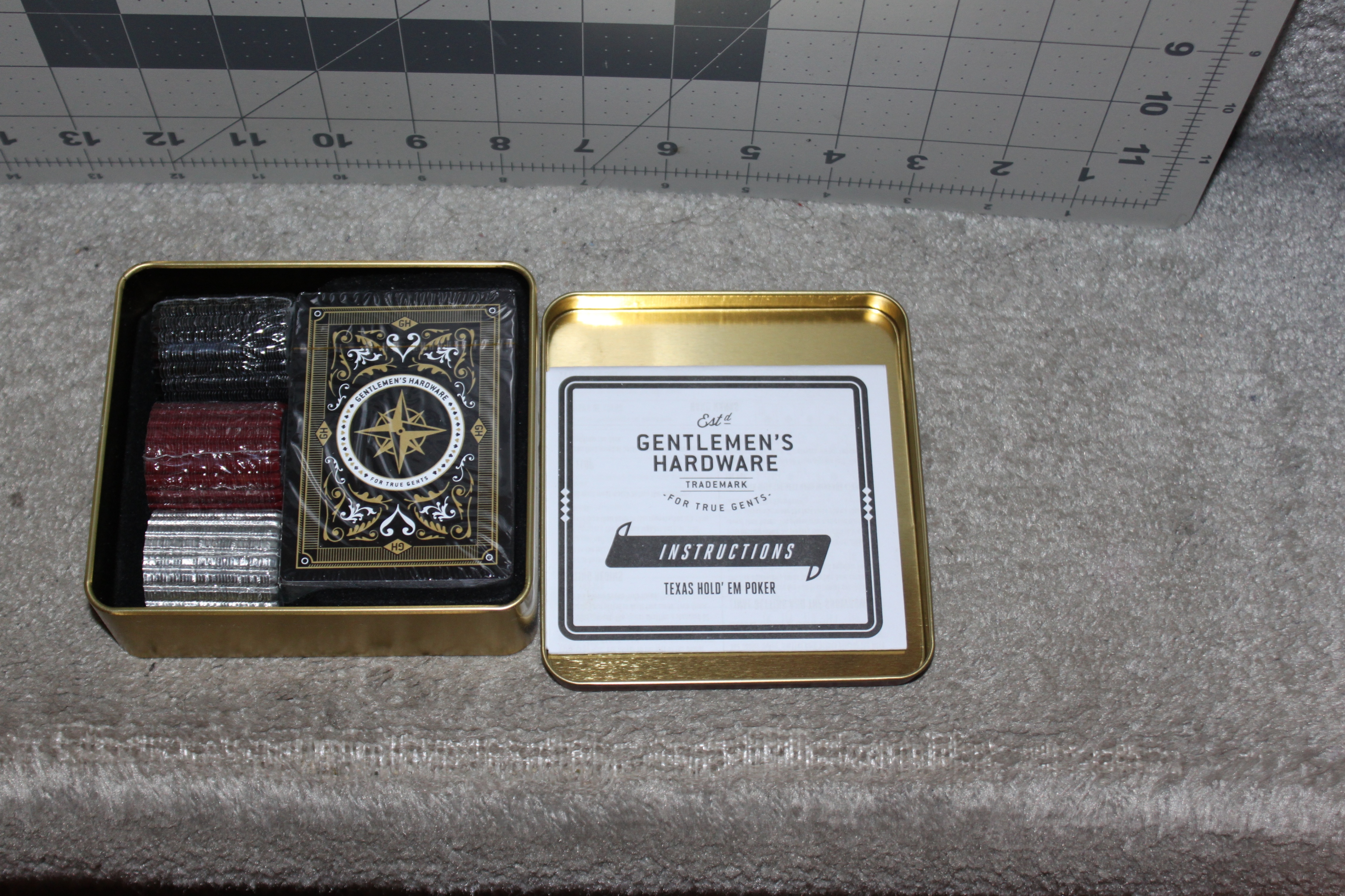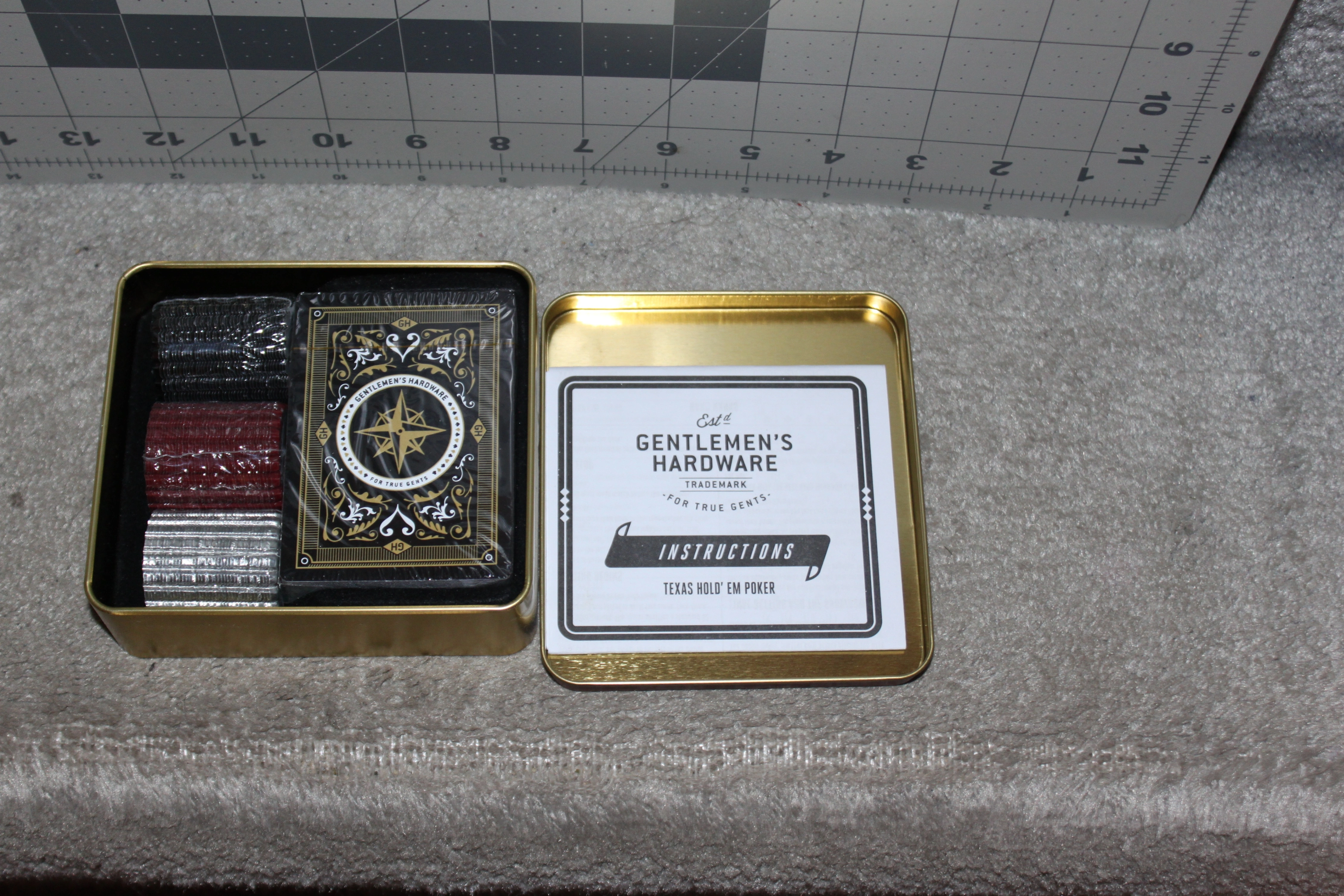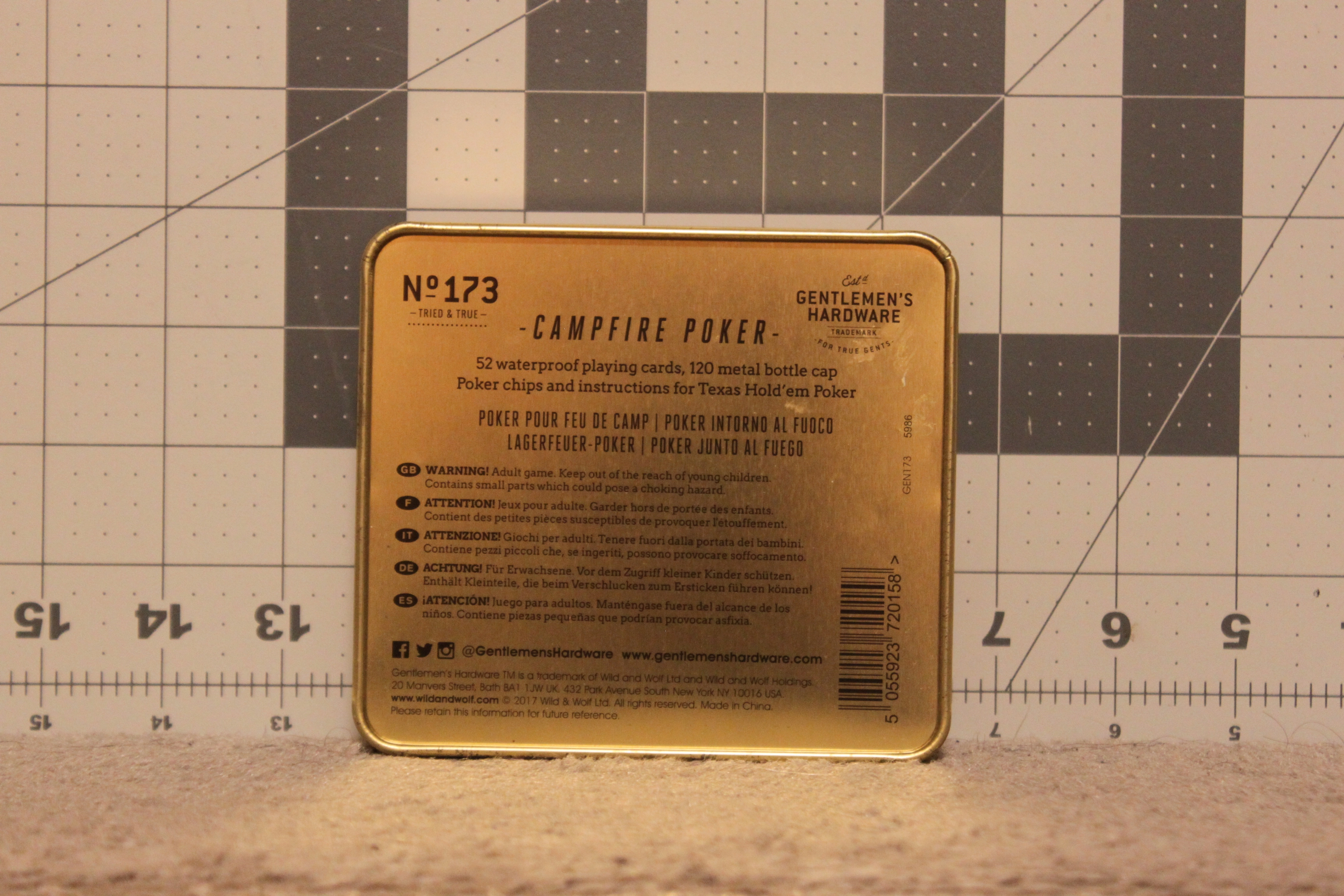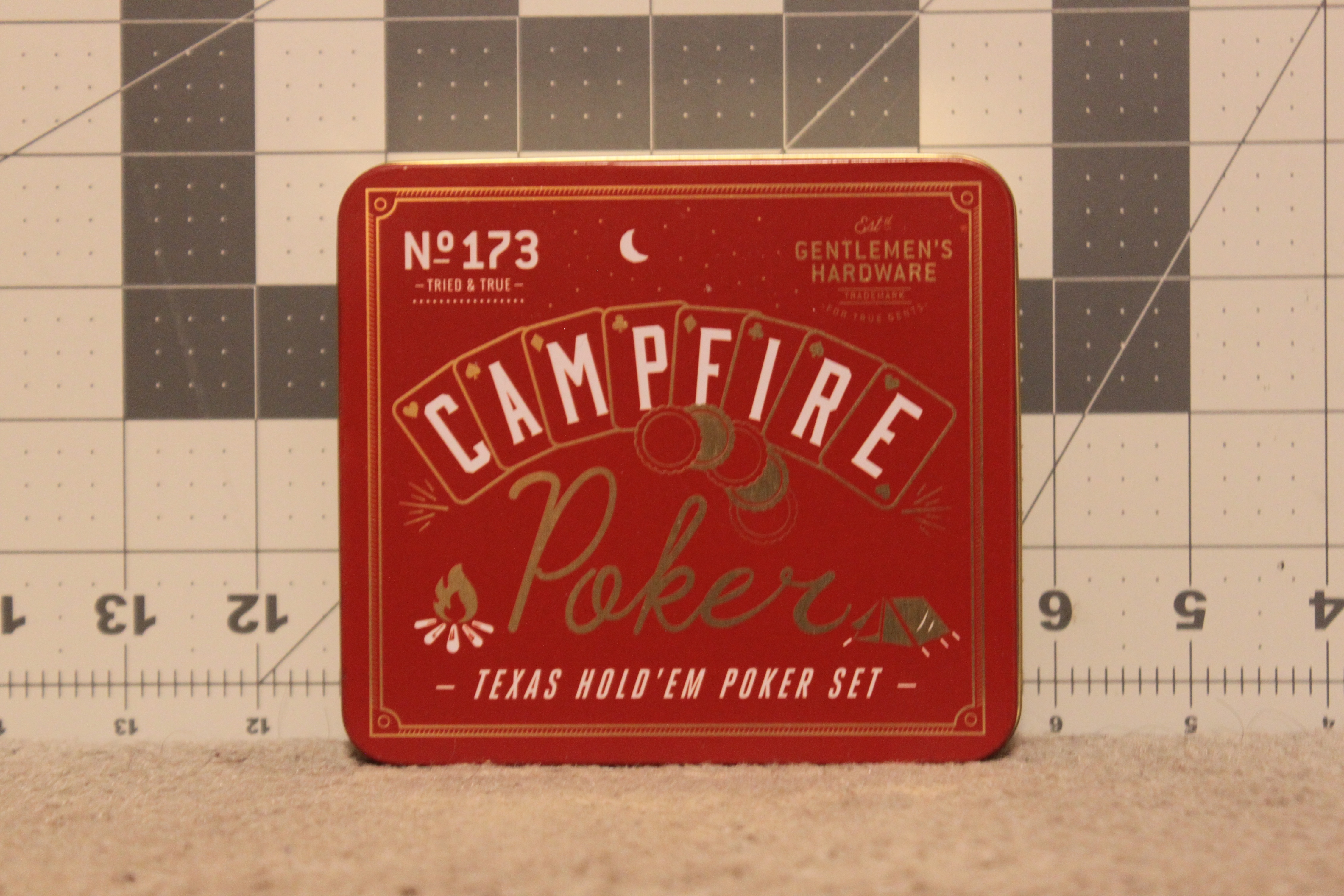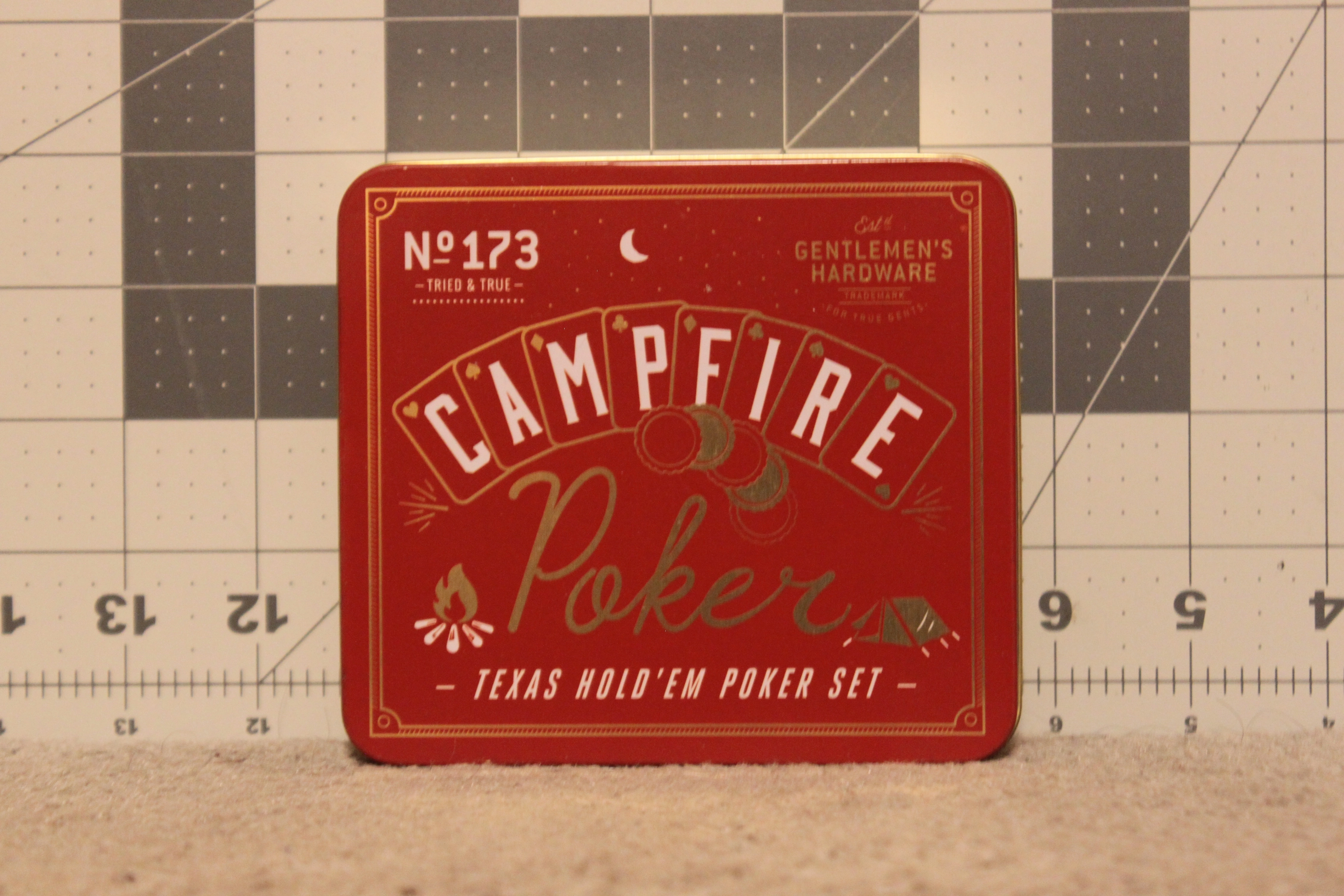 Selling a New and unused Gentlemen’s Hardware Campfire Texas Hold’Em Poker Set. Inside the container contains the sealed deck of 52 waterproof playing cards, and 120 metal bottle cap poker chips