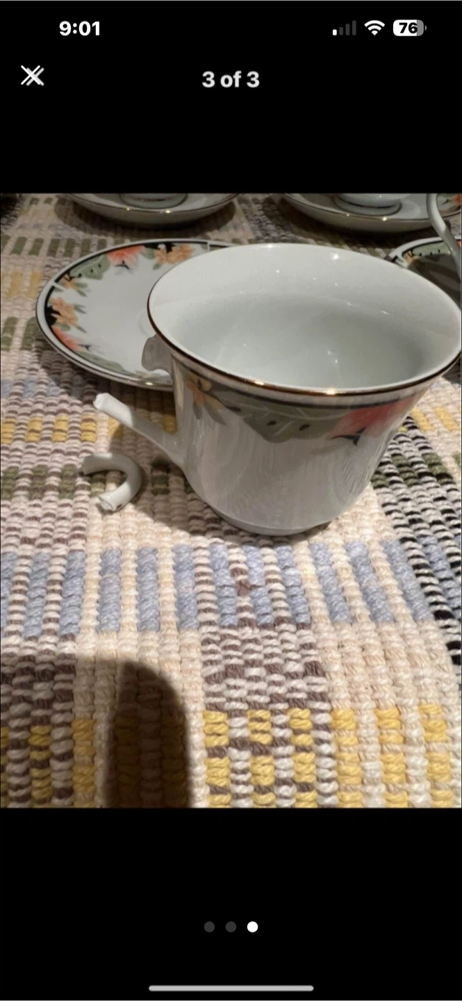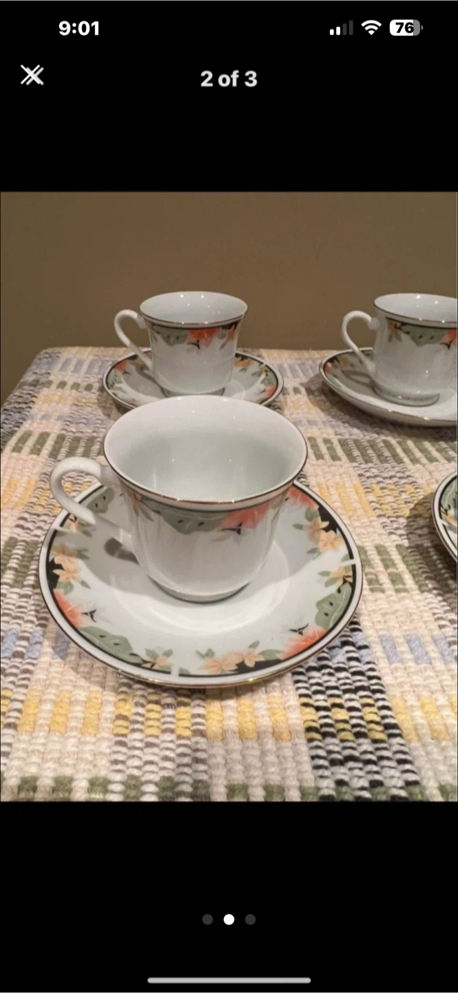 This is a set of six vintage teacups and saucers, featuring a delicate floral pattern with a gold rim. One cup has a small chip on its handle. They're made of ceramic.