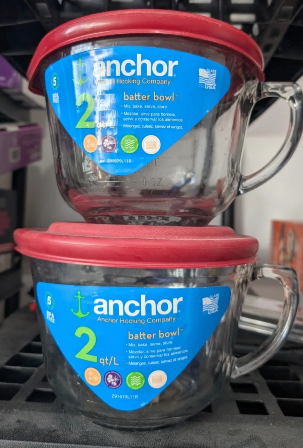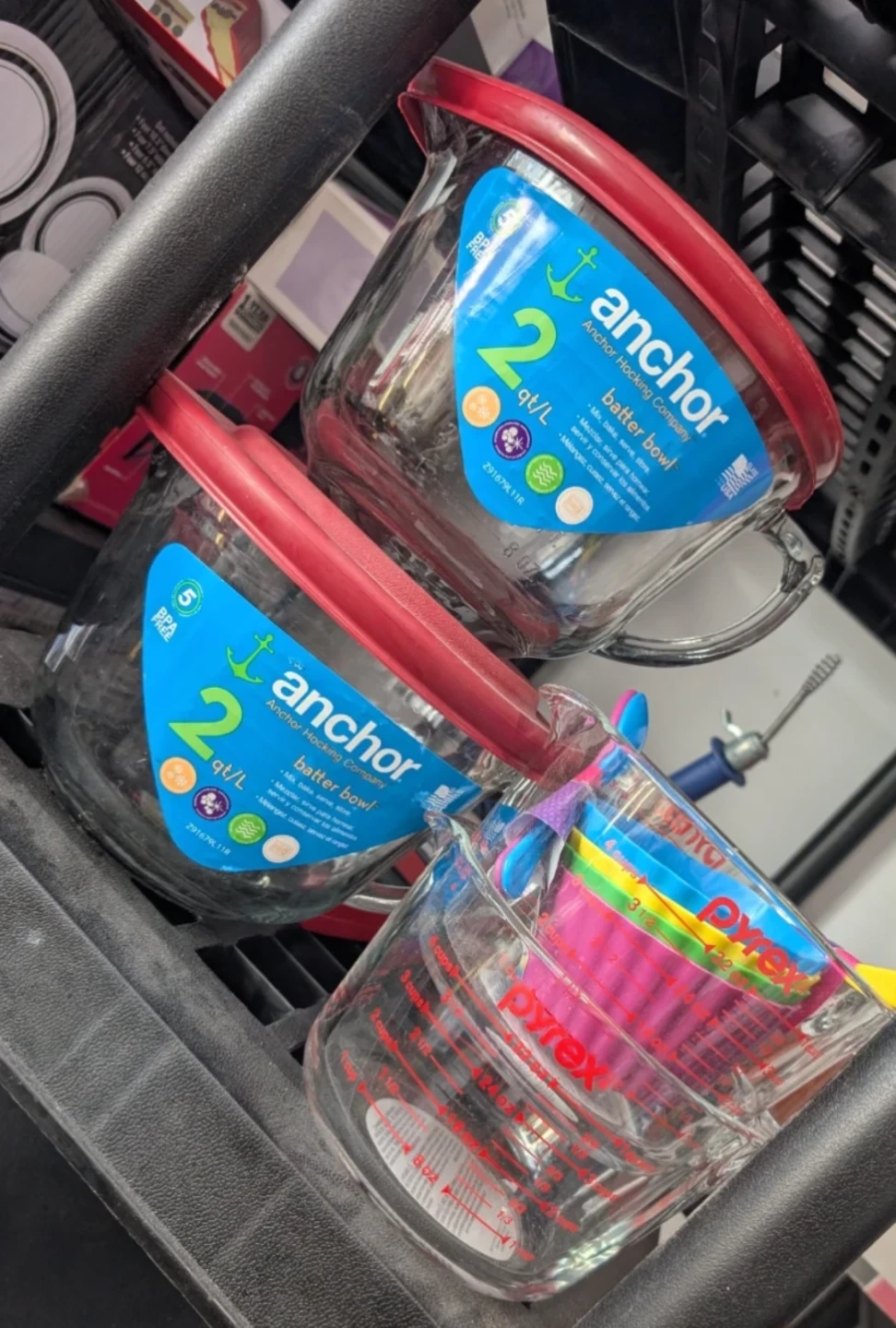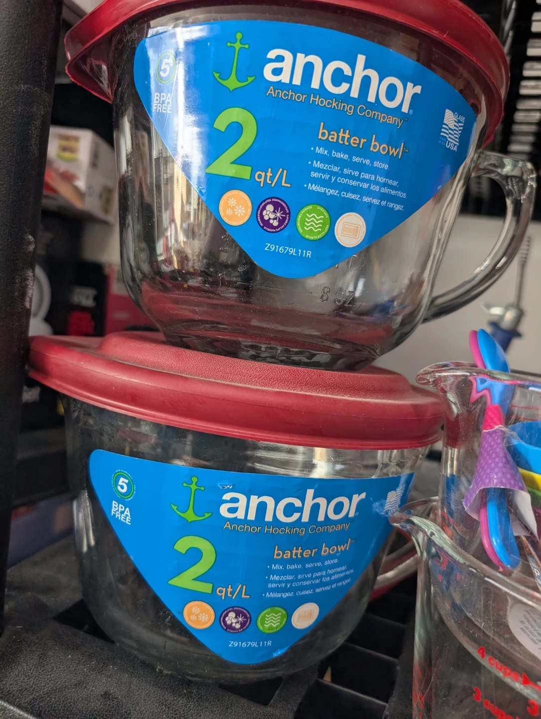 Selling 2 Anchor Hocking 2L Batter Bowl with a lid and 2 Pyrex Glass Measuring Cups. It's perfect for mixing, baking, serving, and storing!