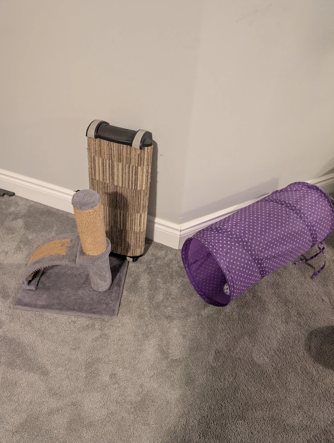 This set includes a small cat scratching post with sisal rope and a purple polka dot cat tunnel. The scratching post has a grey base and post, wrapped in sisal. The tunnel is collapsible and made of fabric. It's great for cats to play and scratch!