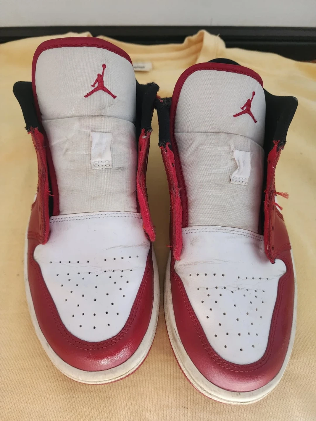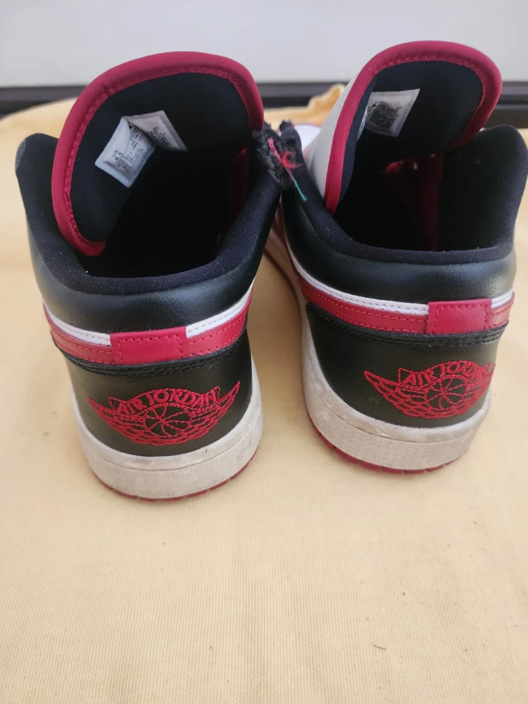 These are Air Jordan 1 Low SE sneakers in red, white, and black. They feature the iconic Jumpman logo on the tongue and the Air Jordan logo on the heel. Rubber sole with Nike branding. shoelaces missing