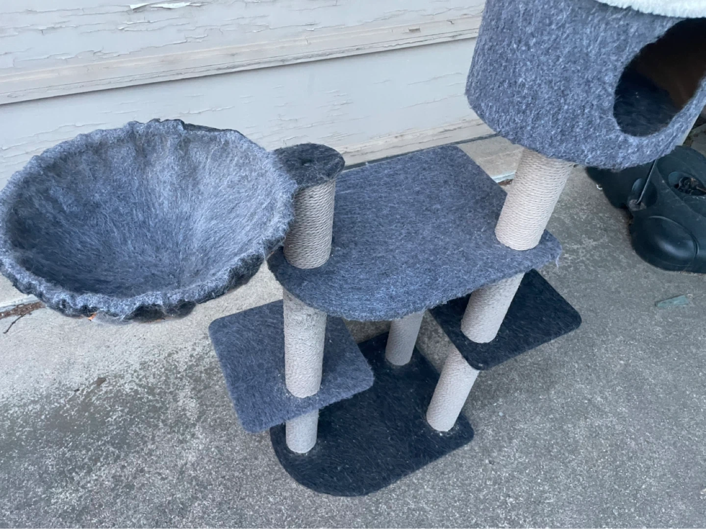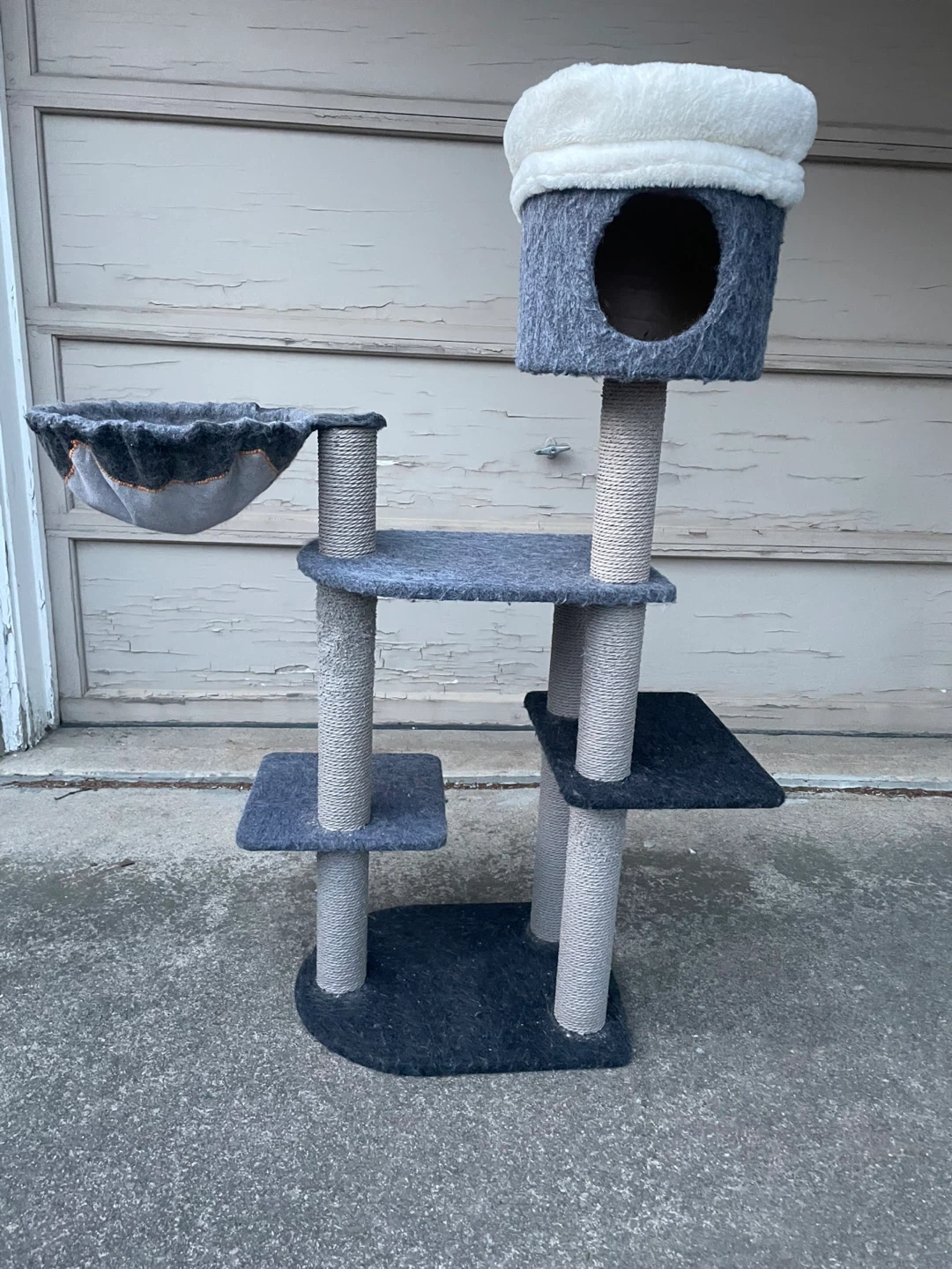 This multi-level cat tree offers plenty of space for your feline friend to play and relax. It features multiple perches, a cozy condo, and scratching posts wrapped in durable rope. The soft, grey carpet material provides a comfortable surface for lounging and climbing. Cats will love exploring and napping on this fun structure!57 inch