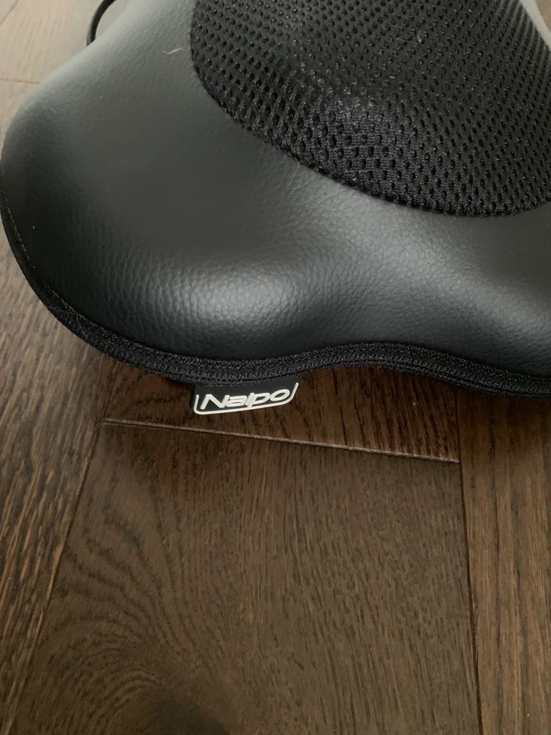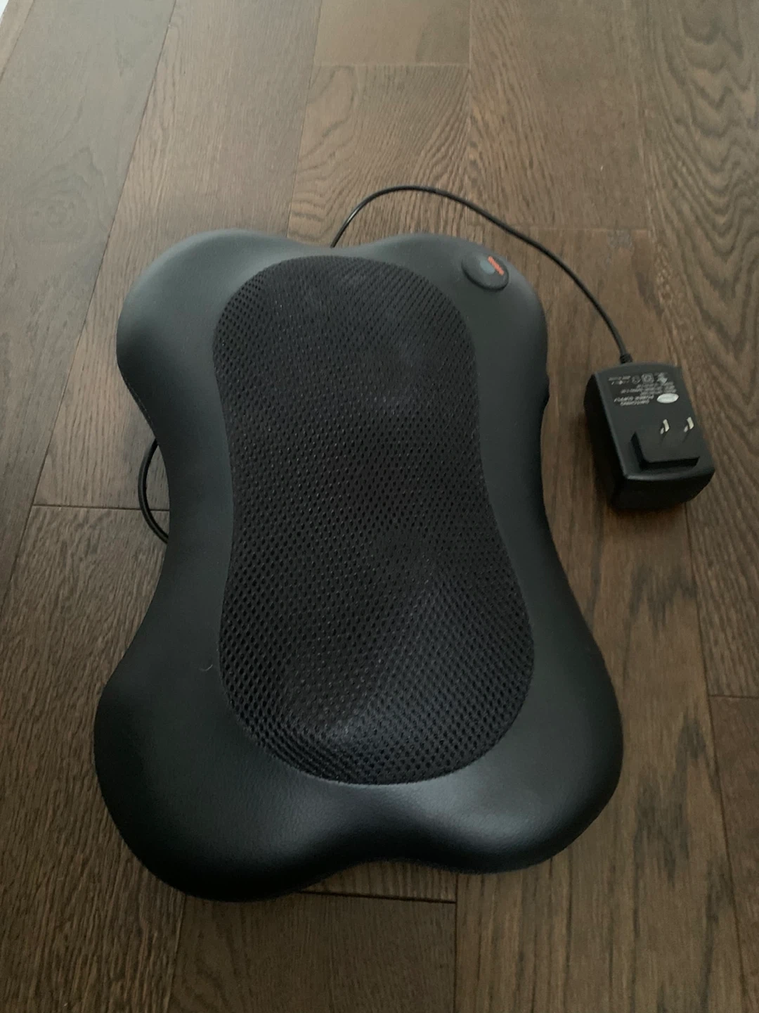 Nobo neck and back massager in black. Includes power adapter. It's made with a mesh fabric and faux leather material. This massager is great for home or office use!