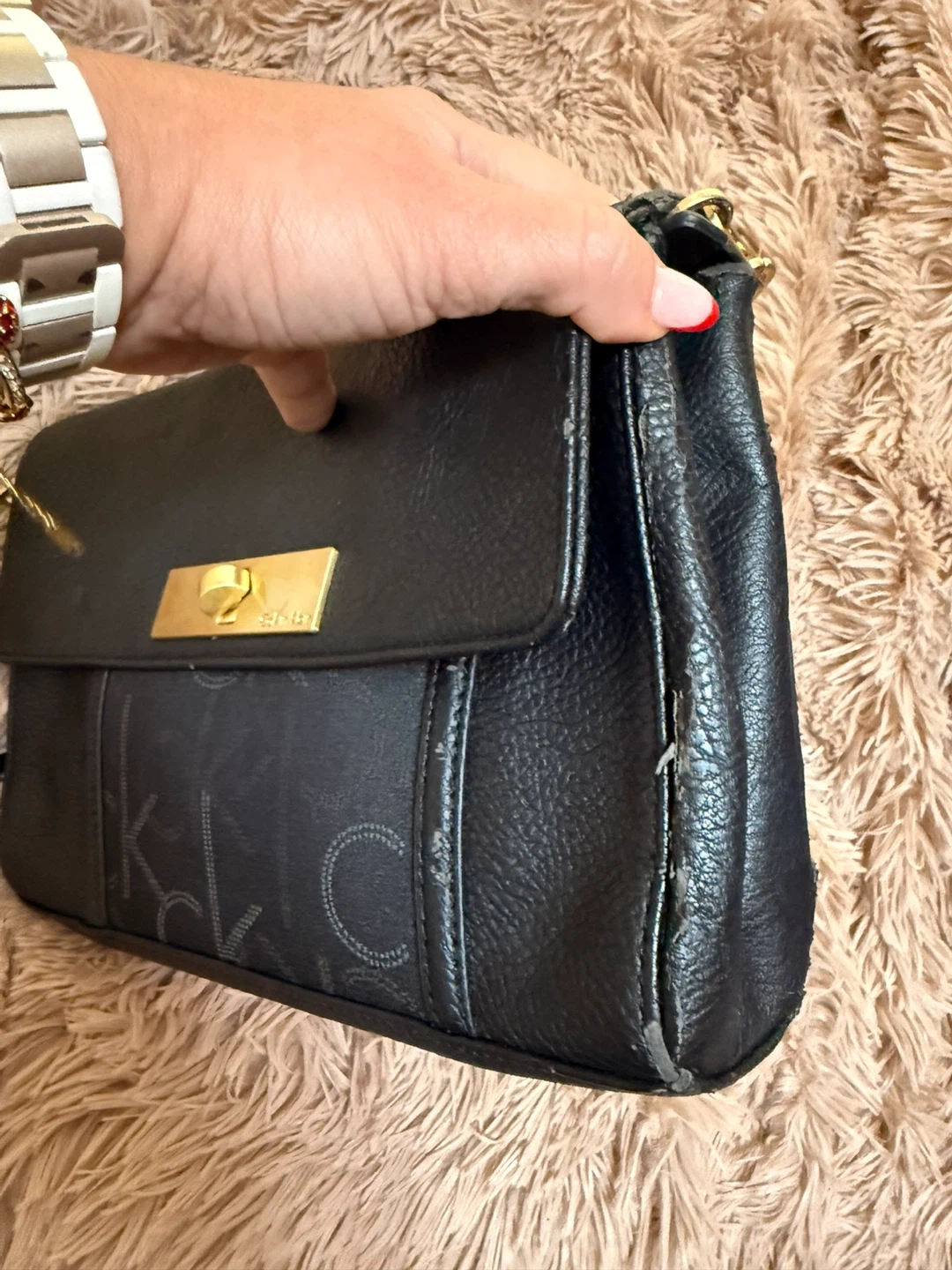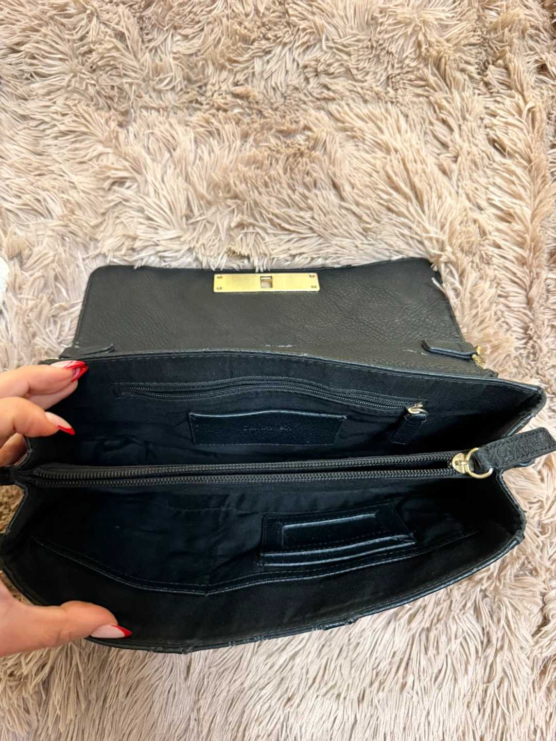 Pre-loved black Calvin Klein shoulder bag with gold hardware. It's made of textured leather. This bag has an interior zip pocket and card slots.