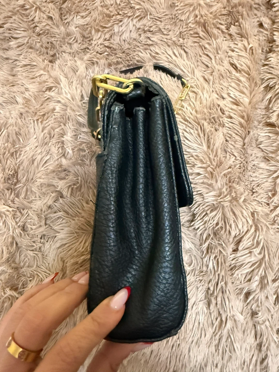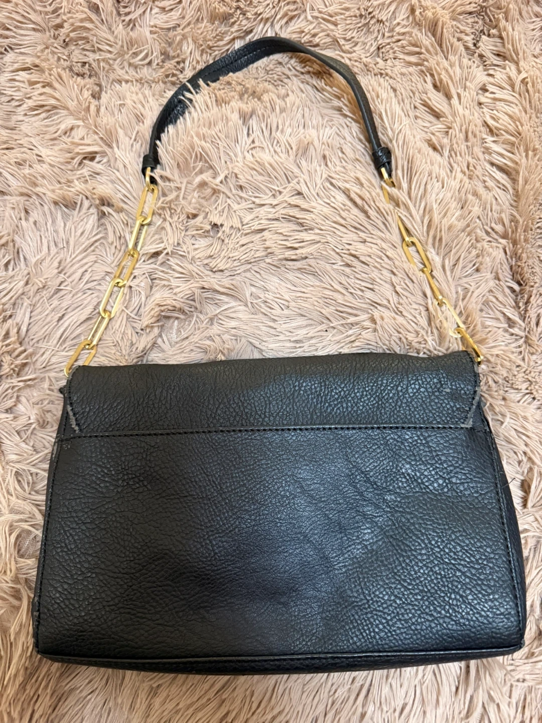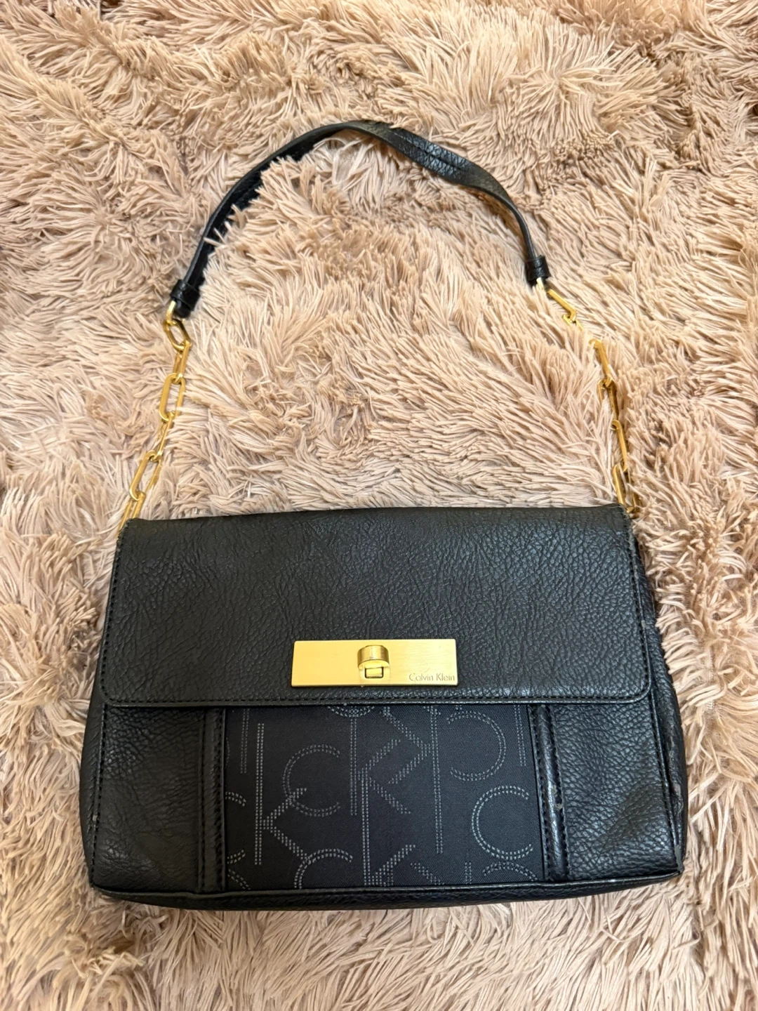 Pre-loved black Calvin Klein shoulder bag with gold hardware. It's made of textured leather. This bag has an interior zip pocket and card slots.