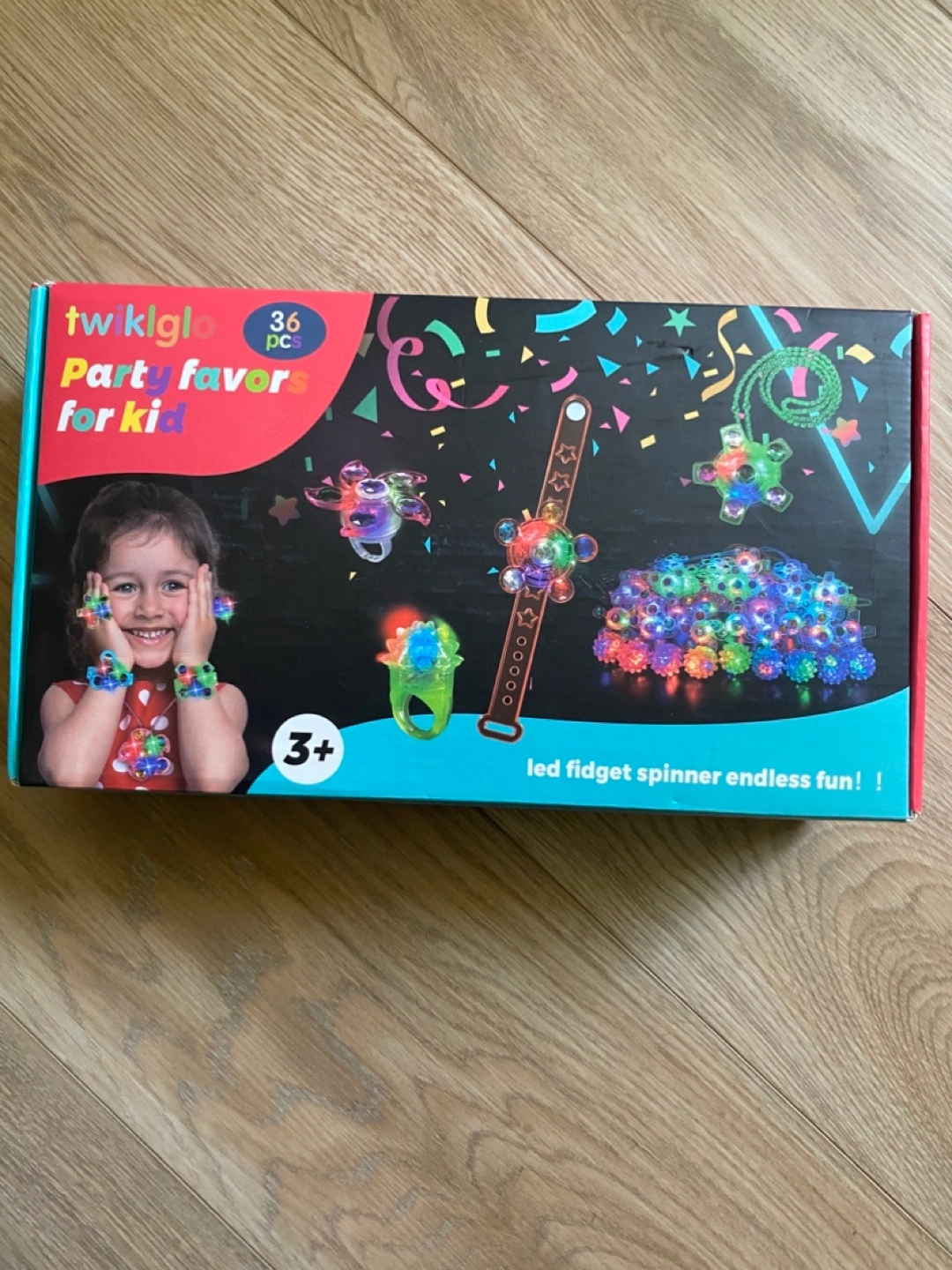 36-piece set of LED fidget spinners. Includes bracelets and rings. Great for parties. Ages 3+. Endless fun!