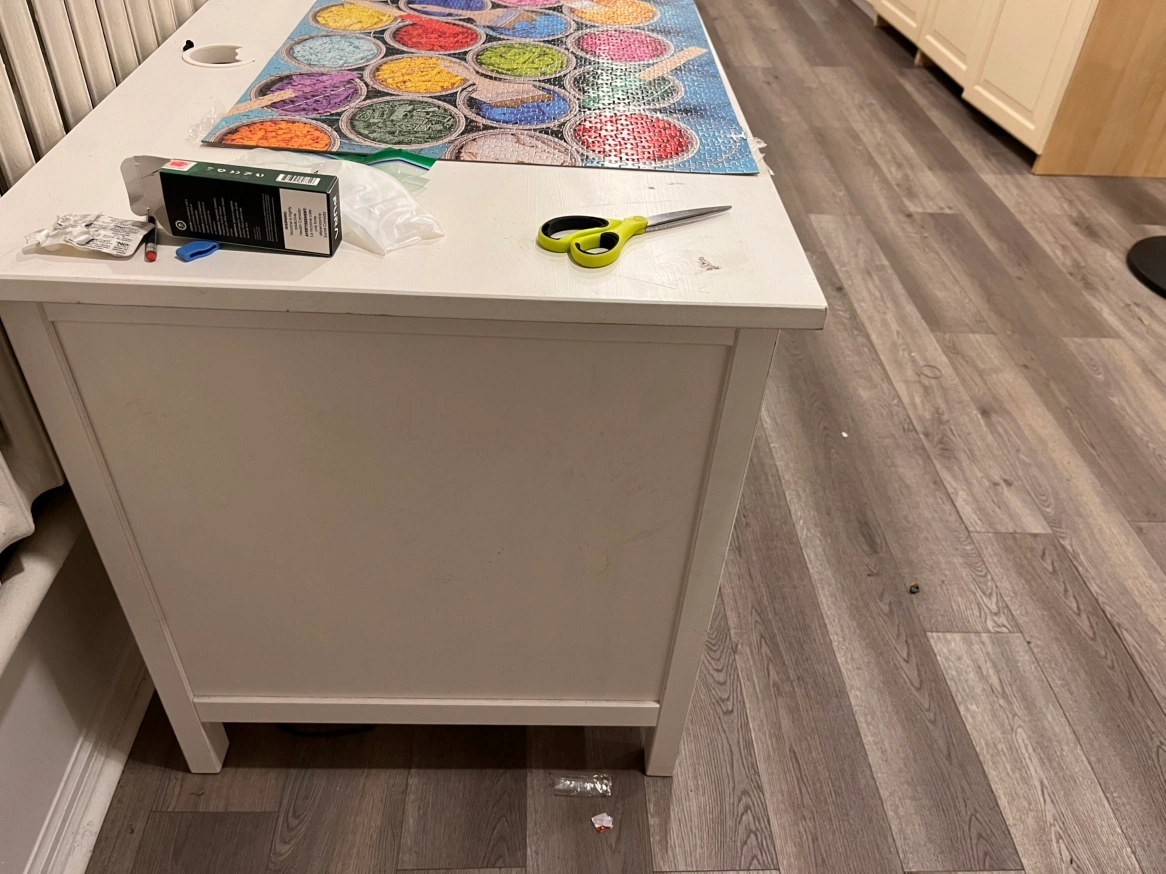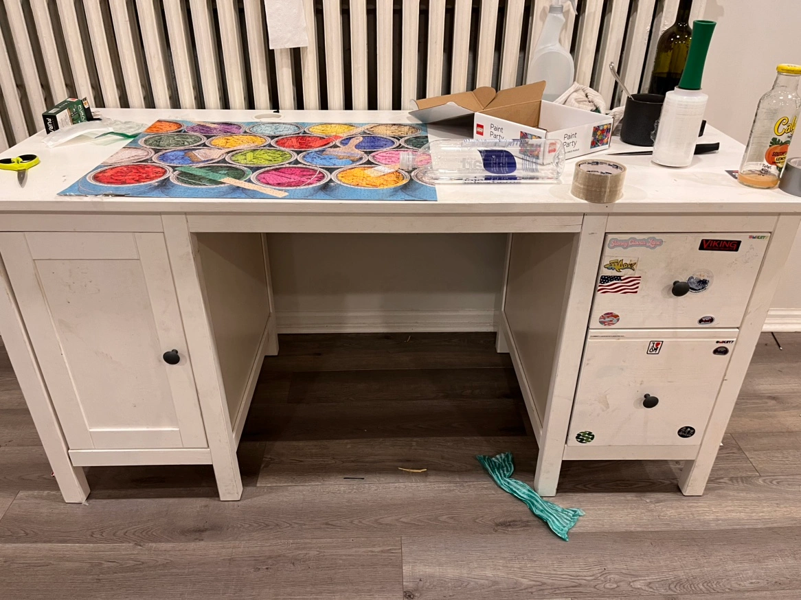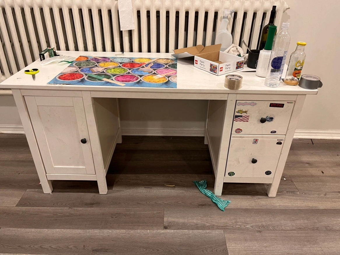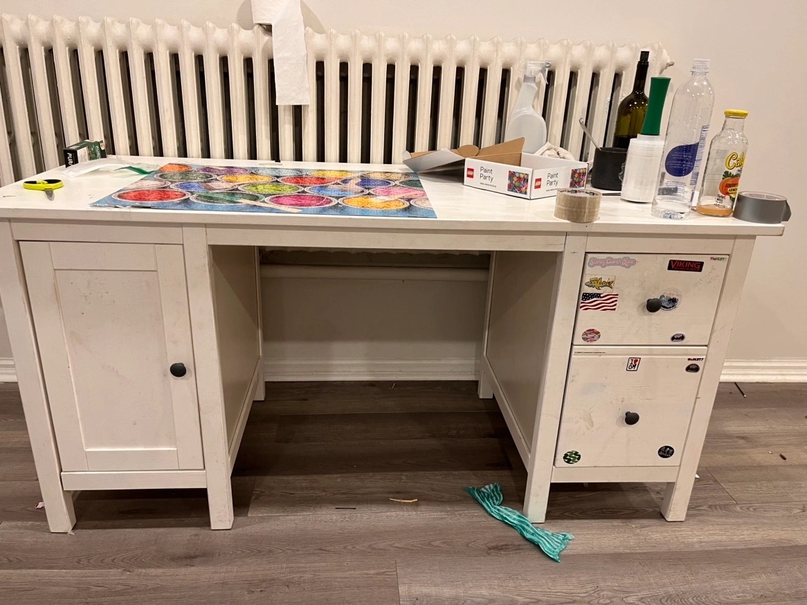 White desk with a drawer and a cabinet. The drawer has a metal pull. The cabinet has a wooden door with a metal knob. There are some stickers on the drawer.