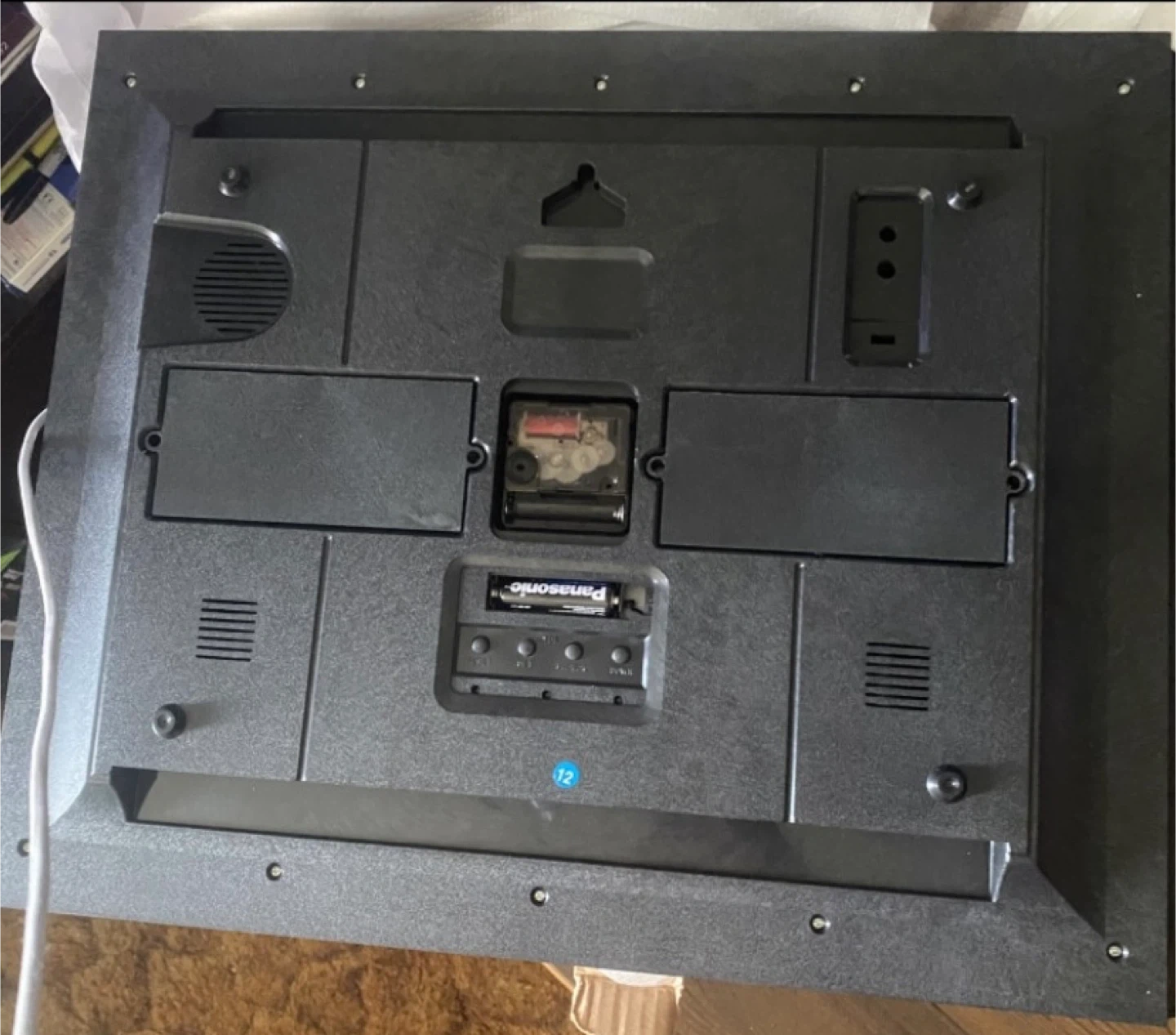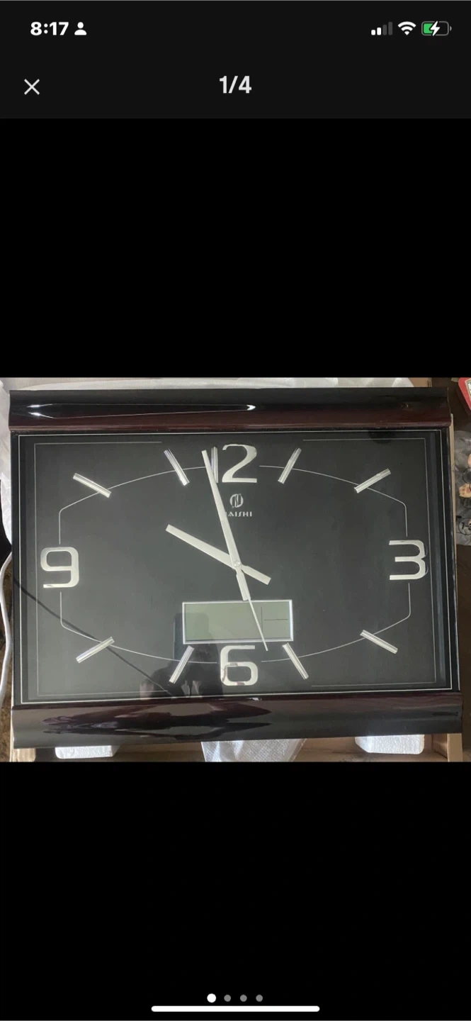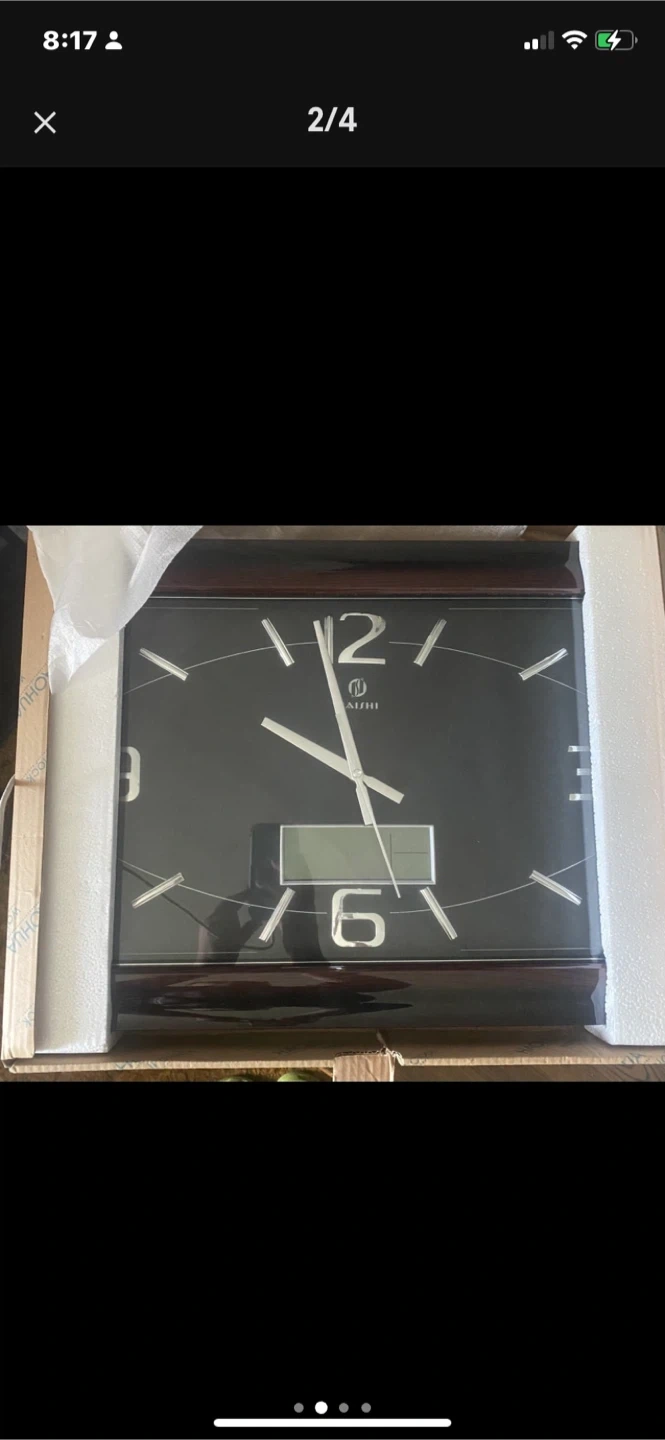 This HAOHUA wall clock features a classic analog display with modern digital readouts. It's housed in a dark wood-effect frame. The clock shows the time, date, and day of the week. It runs on a quartz movement and includes a Panasonic AA battery.