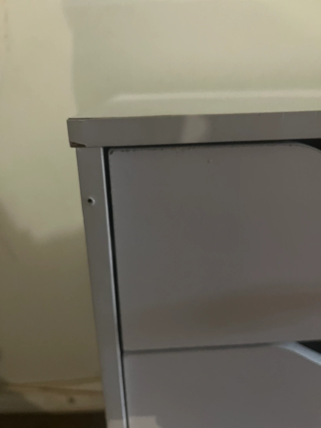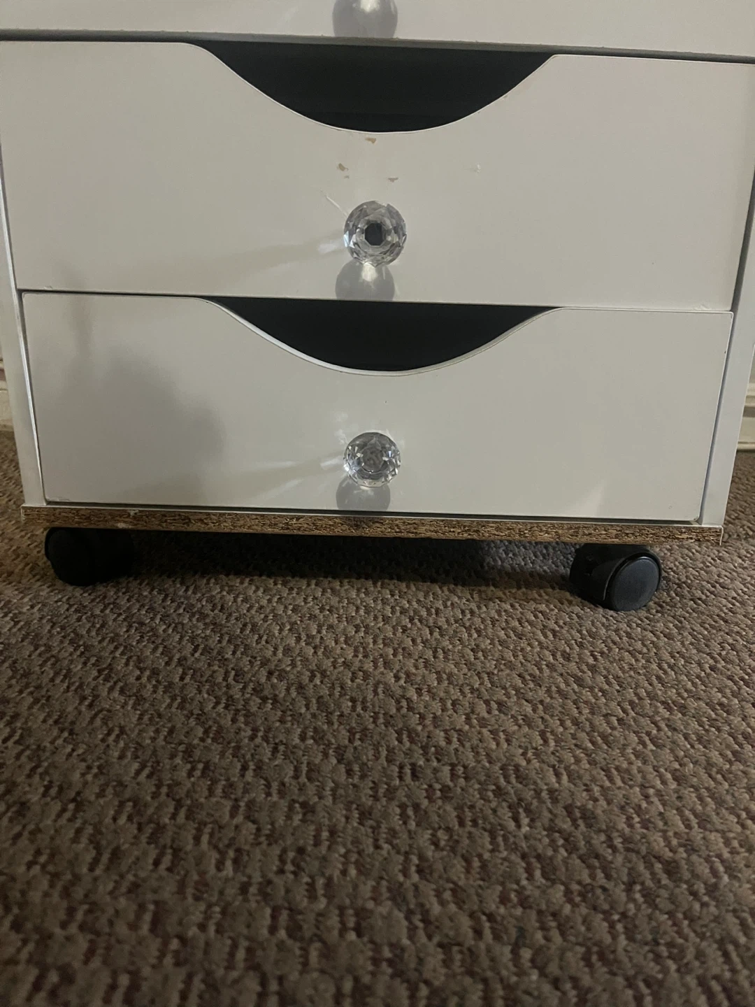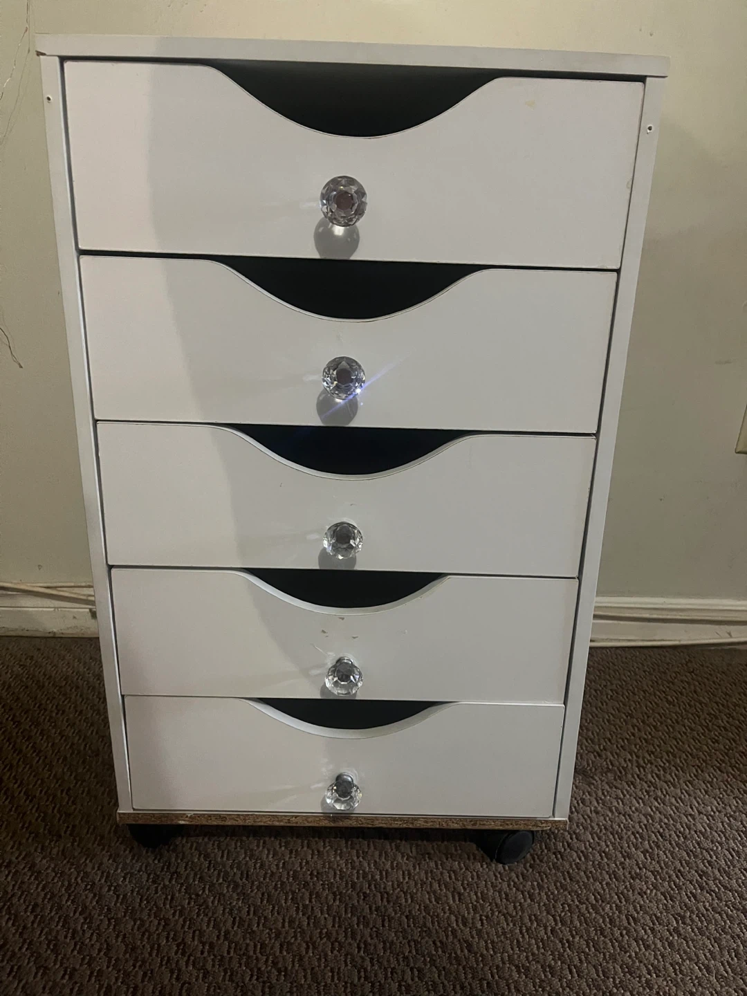 White five-drawer storage unit with crystal knobs. It's great for organizing small items. Each drawer is a good size for various supplies. (Little wear and tear other than that it’s in great condition)