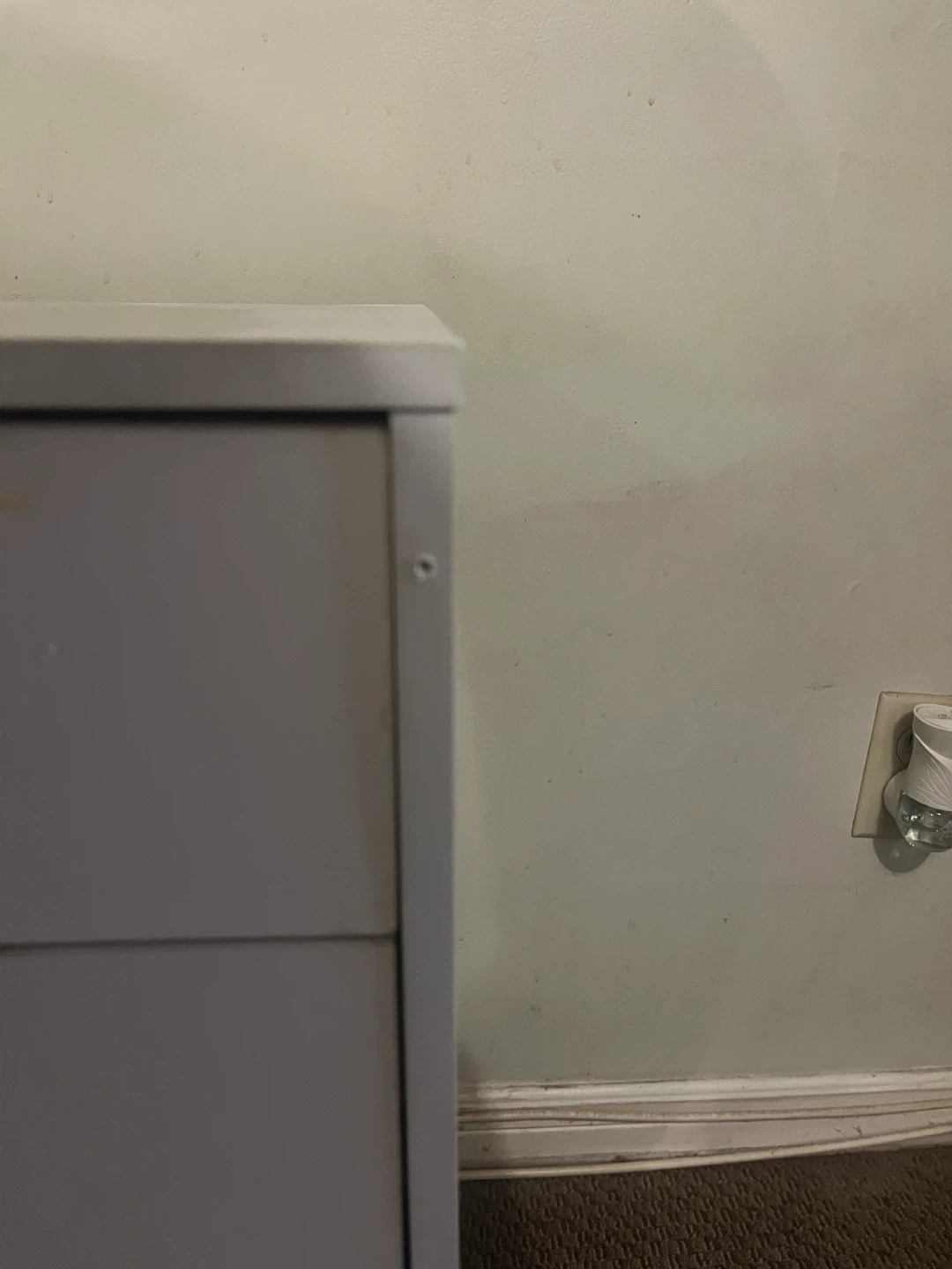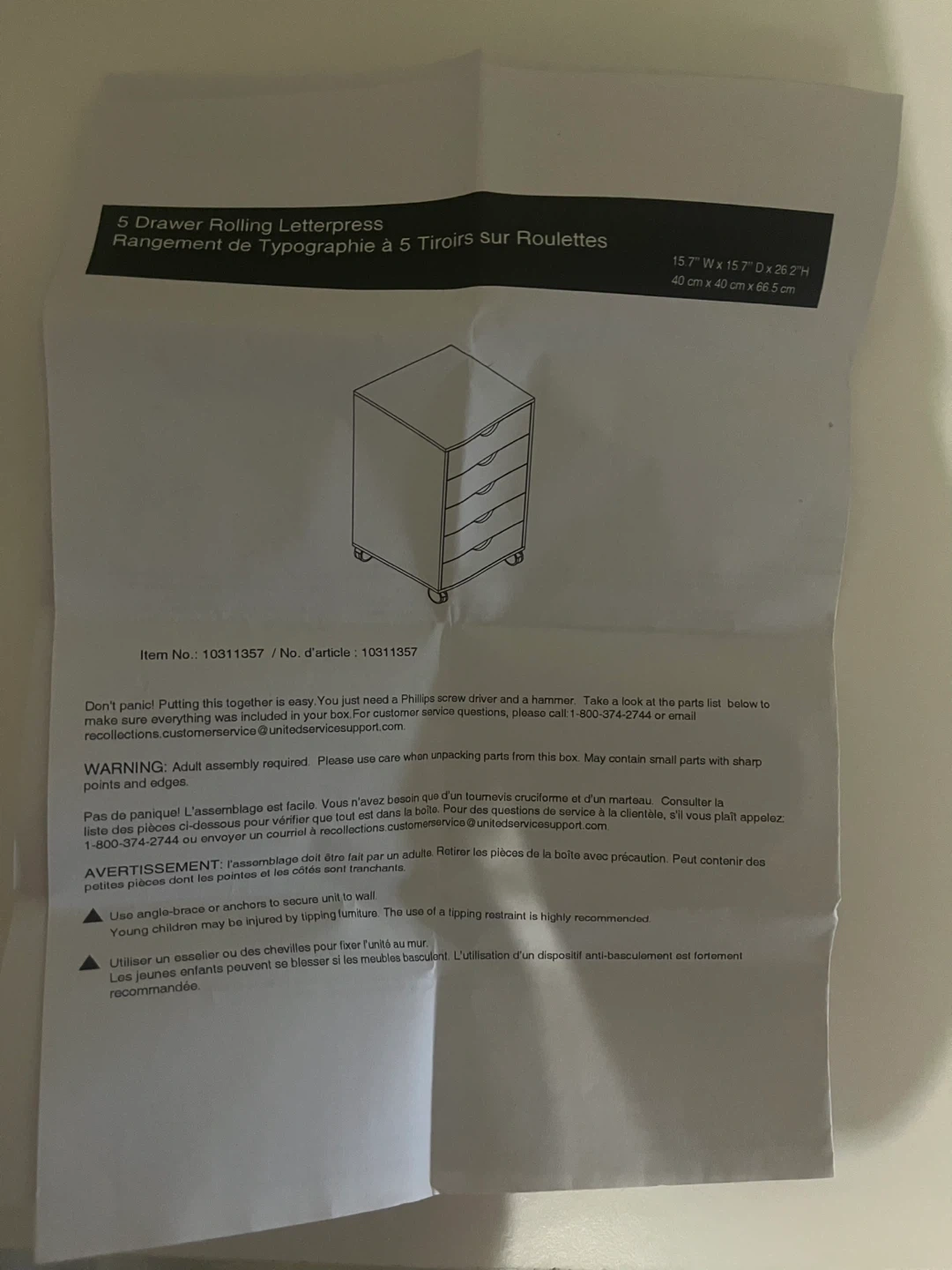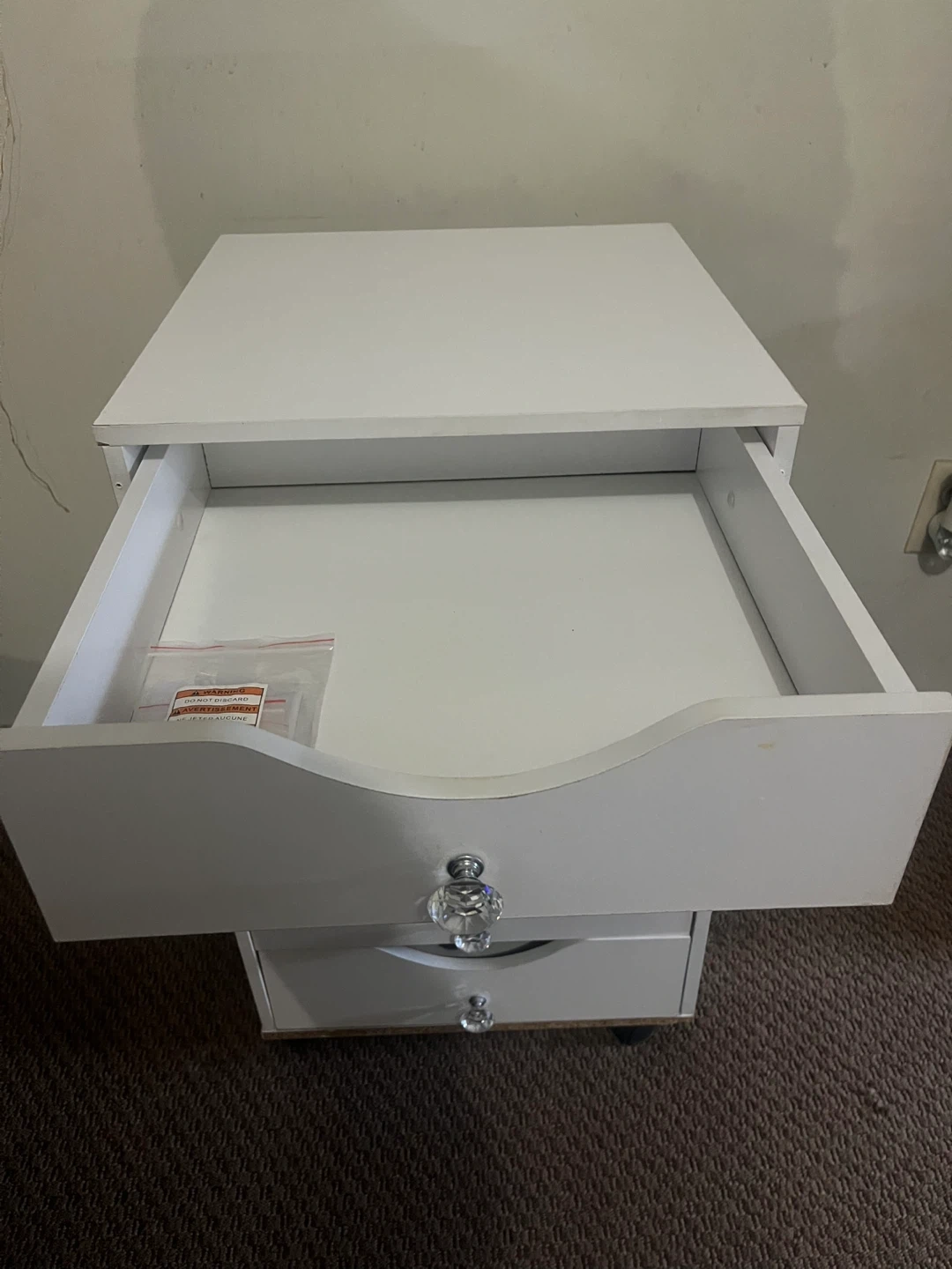 White five-drawer storage unit with crystal knobs. It's great for organizing small items. Each drawer is a good size for various supplies. (Little wear and tear other than that it’s in great condition)