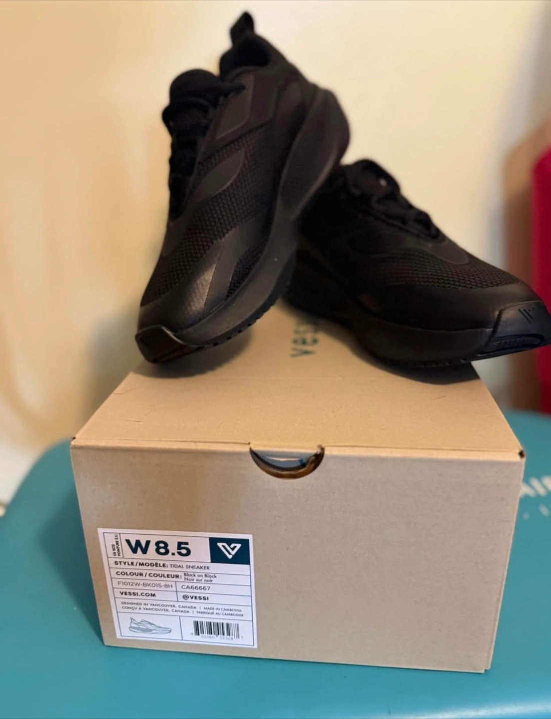 Selling a pair of Vessi Tidal Sneakers in black, women's size 8.5! They come with the original box. These sneakers are perfect for everyday wear and are designed in Vancouver, Canada