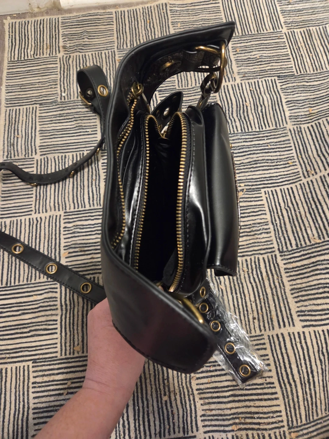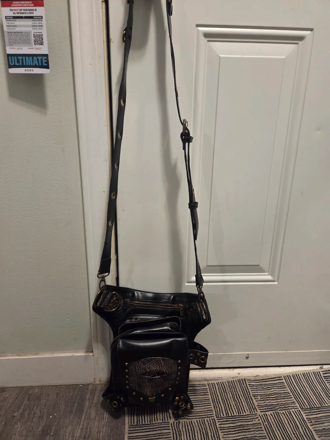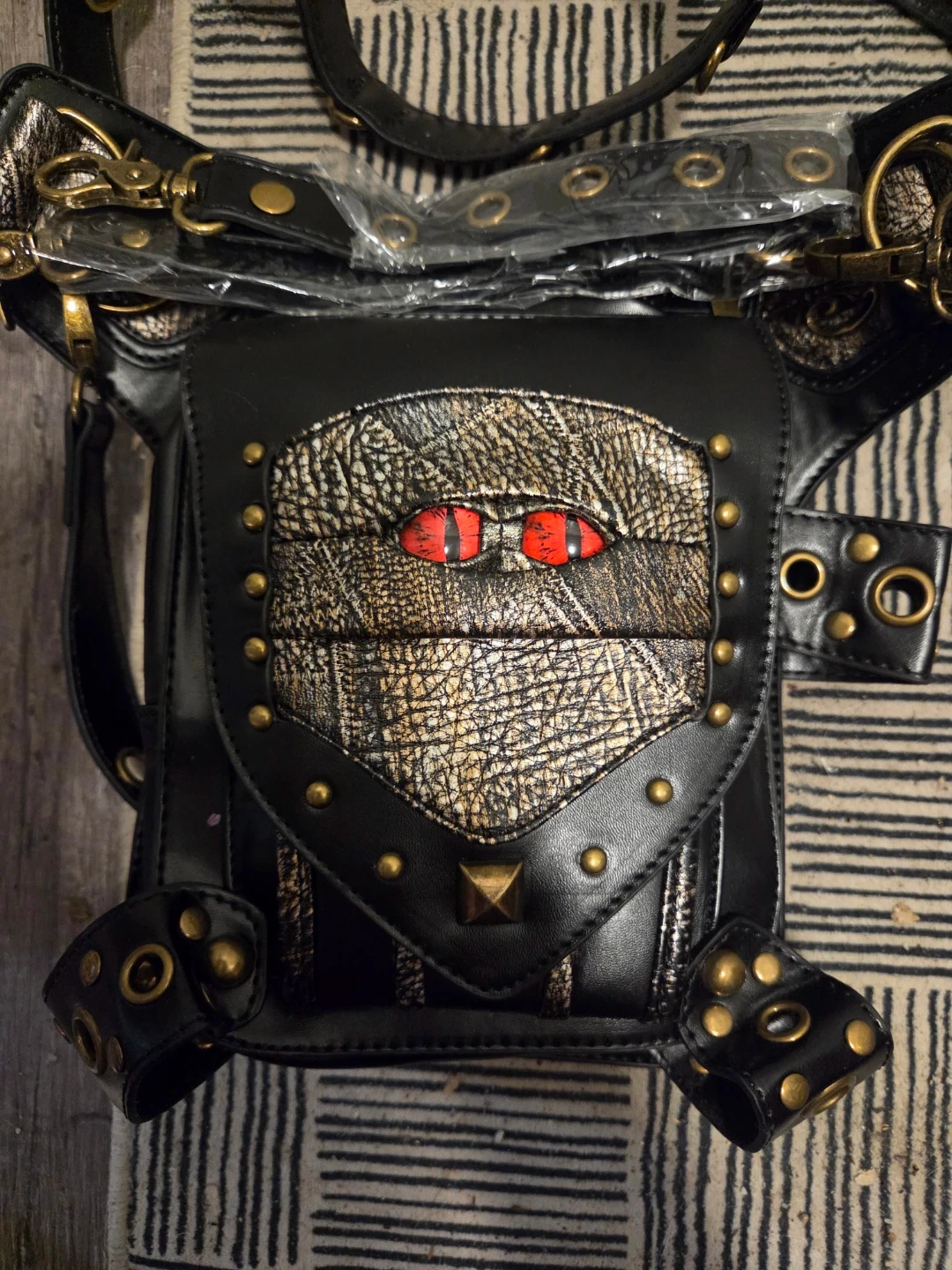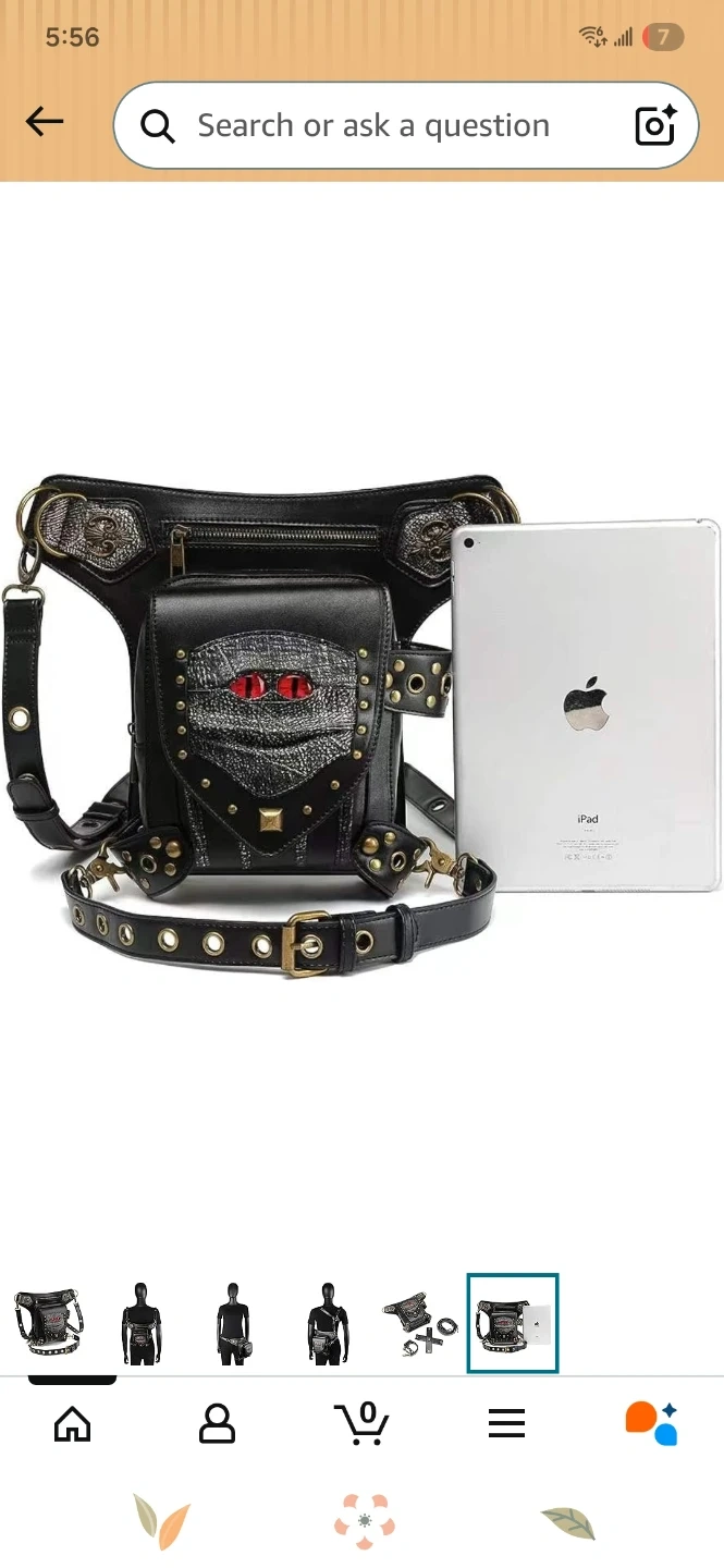 This black PU leather waist bag features a unique steampunk design It has a zippered main compartment and additional pockets. Adjustable straps allow it to be worn around the waist or as a leg bag this bag sell for 71 dollars on Amazon