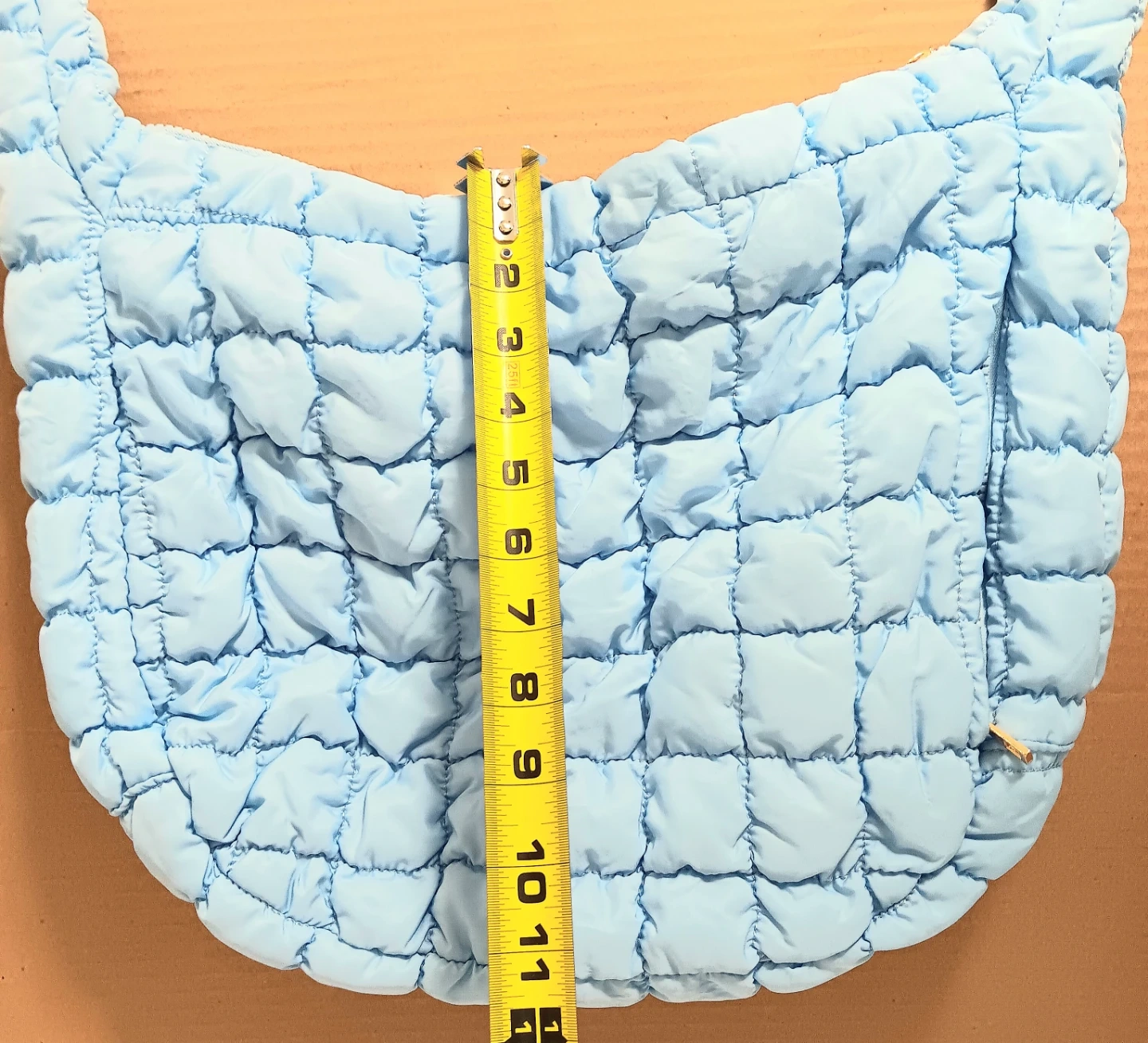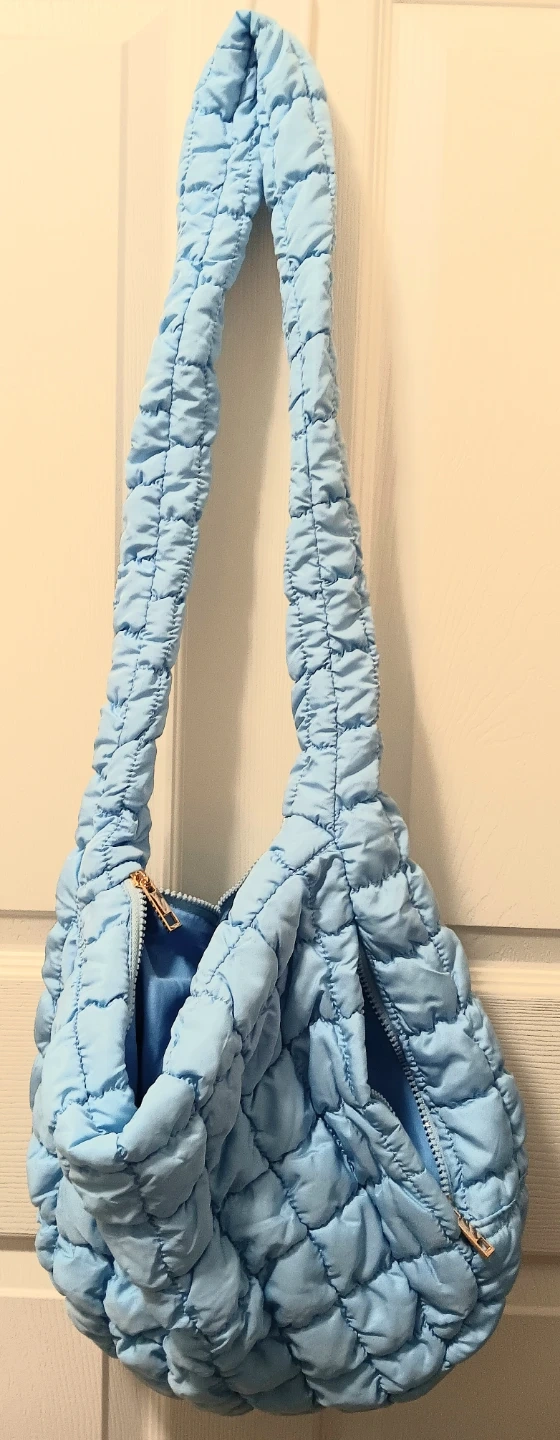 This is a light blue quilted bag is in new condition, with a zip closure. It's the perfect accessory for adding a pop of colour to your outfit. It's approximately 15 inches wide and 11 inches tall.