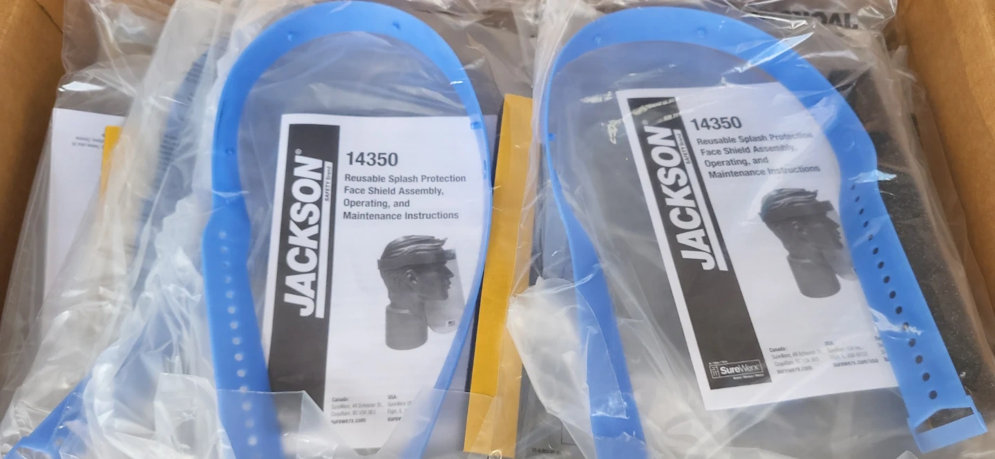 Two Jackson 14350 reusable splash protection face shield assemblies are included. These come with operating and maintenance instructions. They are blue in colour. $5 each or entire box of 40 pc $185