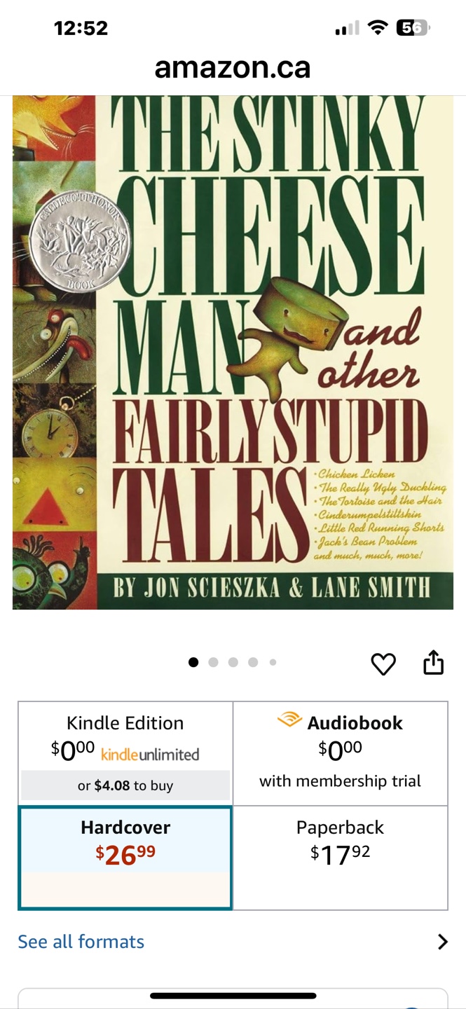 Selling a hardcover copy of "The Stinky Cheese Man and Other Fairly Stupid Tales" by Jon Scieszka & Lane Smith! It includes 10 complete stories and 25 lavish paintings. A funny and good book to buy now!