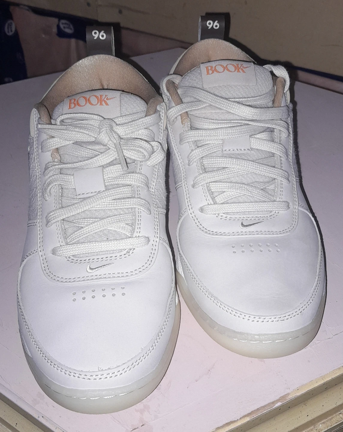 Size 9 mens White Nike SB sneakers with "BOOK" branding on the tongue. They feature a mix of leather and textured fabric panels. This pair has pull tabs on the heel and tongue for easy on and off.