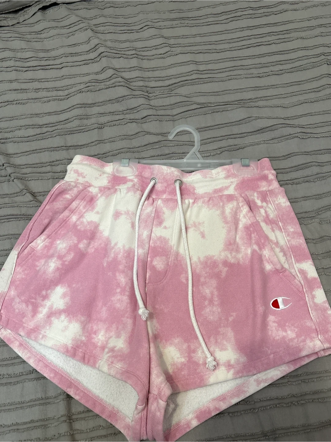 Selling a pair of Champion shorts with a cute pink and white tie-dye pattern. They have a drawstring waist and the Champion logo on the leg. Perfect for lounging or casual wear!