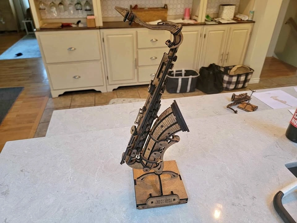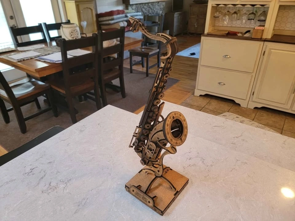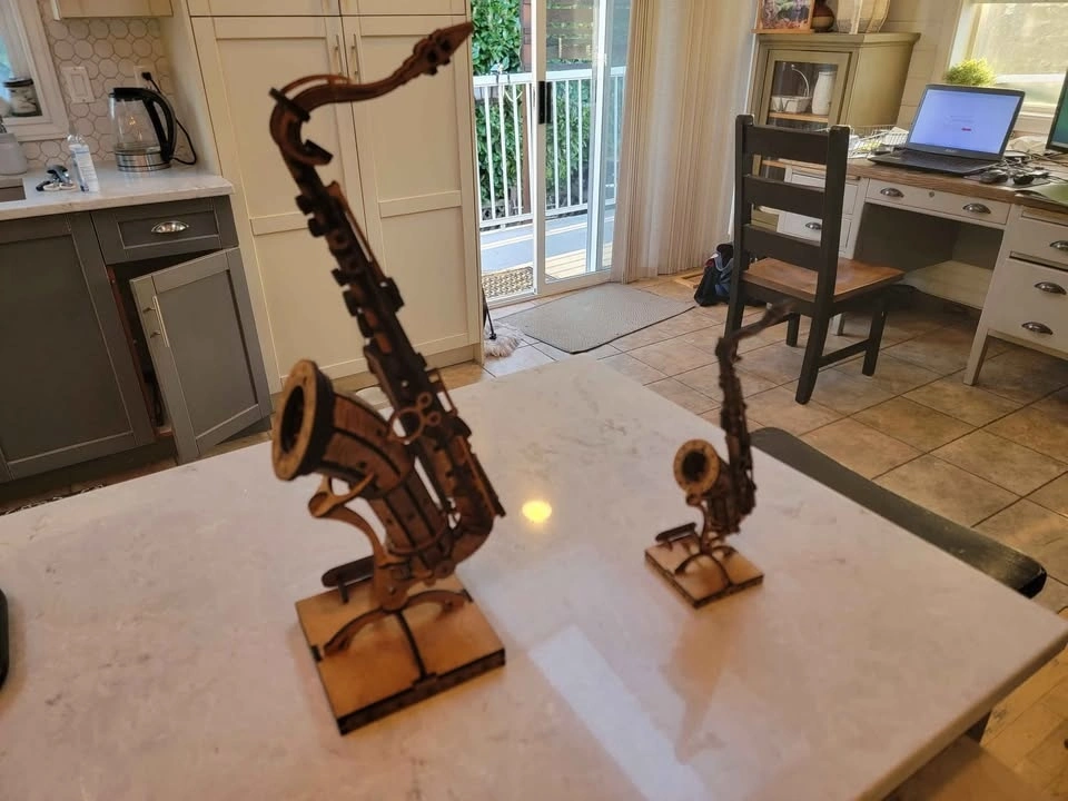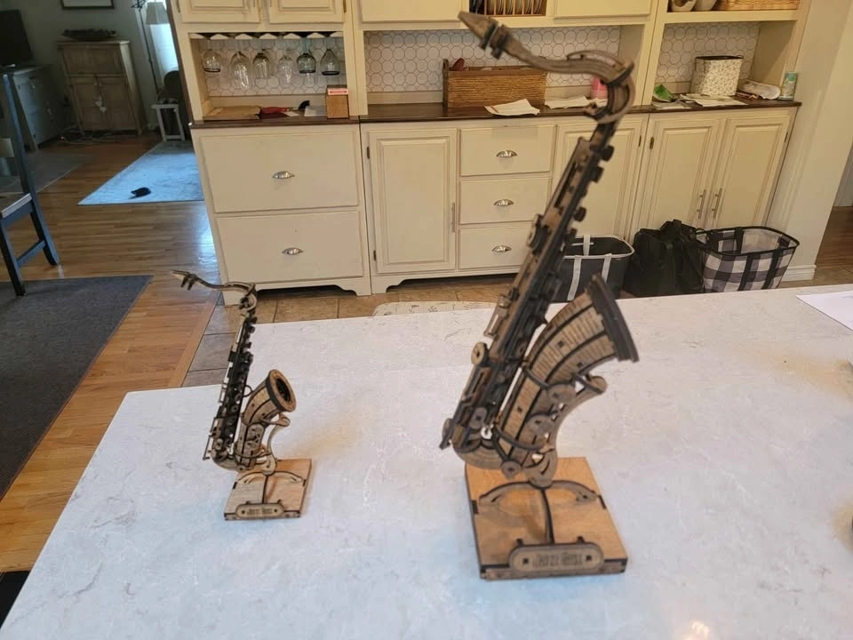 Intricate wooden model of a saxophone for display. Assembled or as a DIY model kit with instructions. Detailed design. Great for musicians. Fantastic gift idea. Two sizes available: Large is 19 inches tall and small is 11 inches tall. Small Saxophone is $50.00. Items are available for pickup by arrangement. I make most of these products myself, so I can usually make more if desired. Feel free to message if you have any questions!
