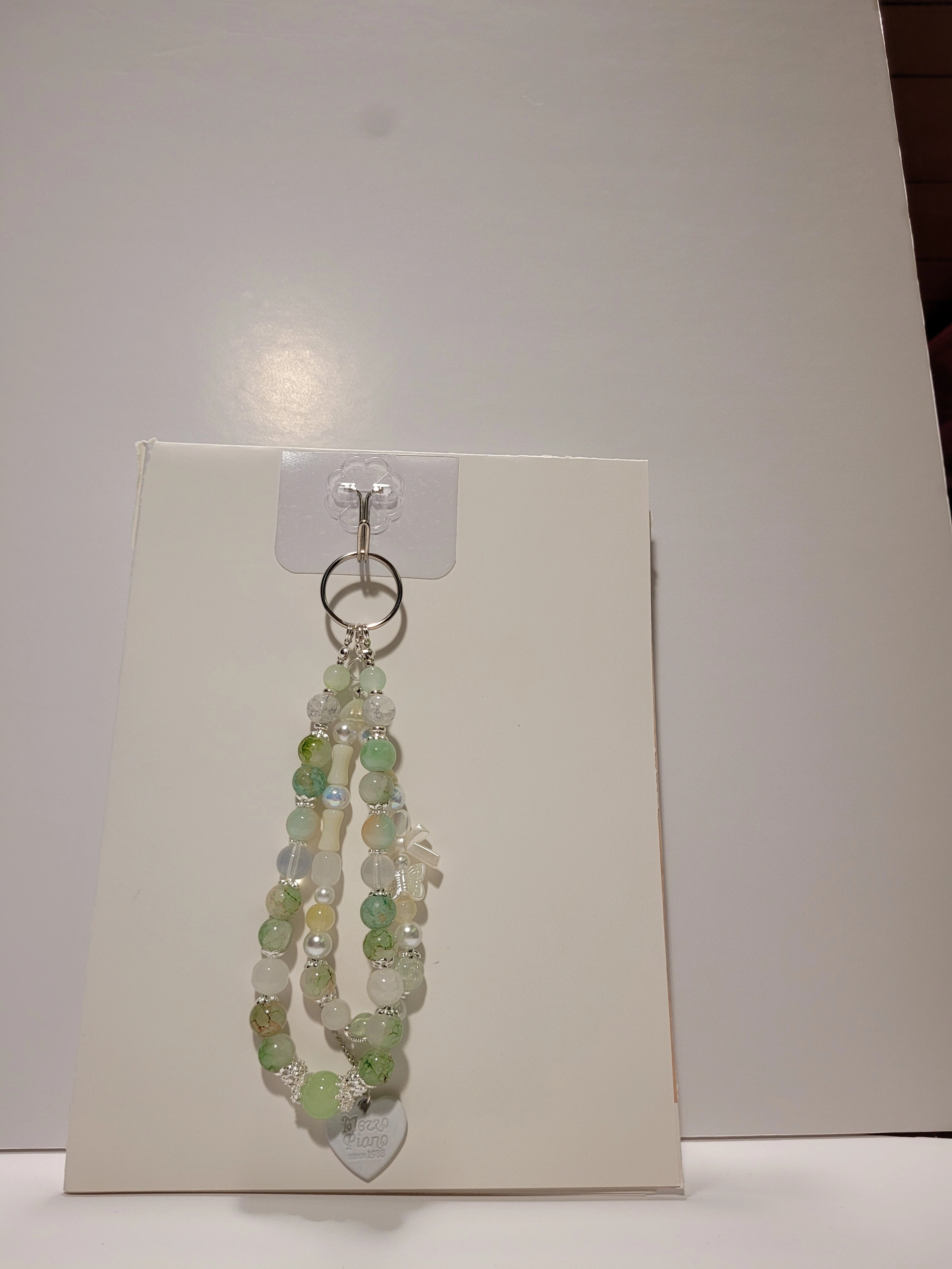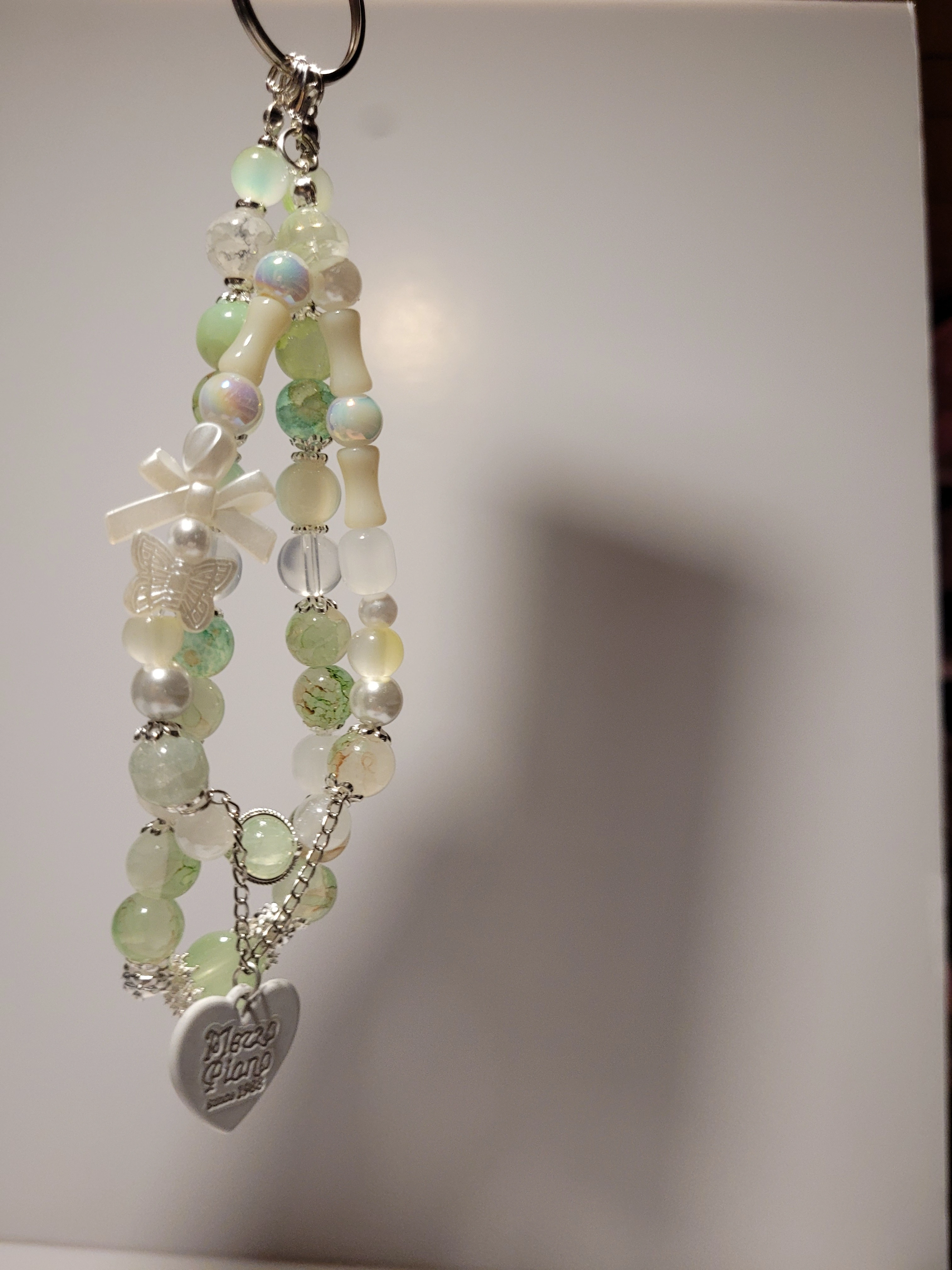 Selling a cute handmade beaded keychain! It features a mix of green and white beads, with a little butterfly and heart charm. Perfect for adding a touch of charm to your keys or bag