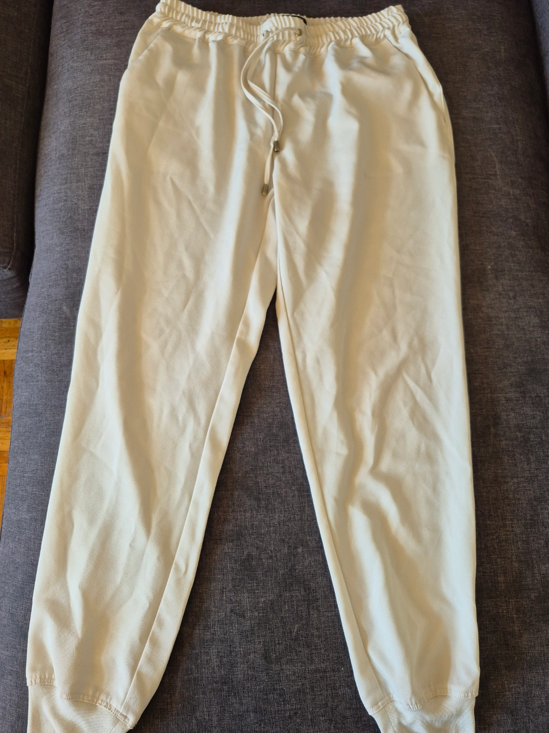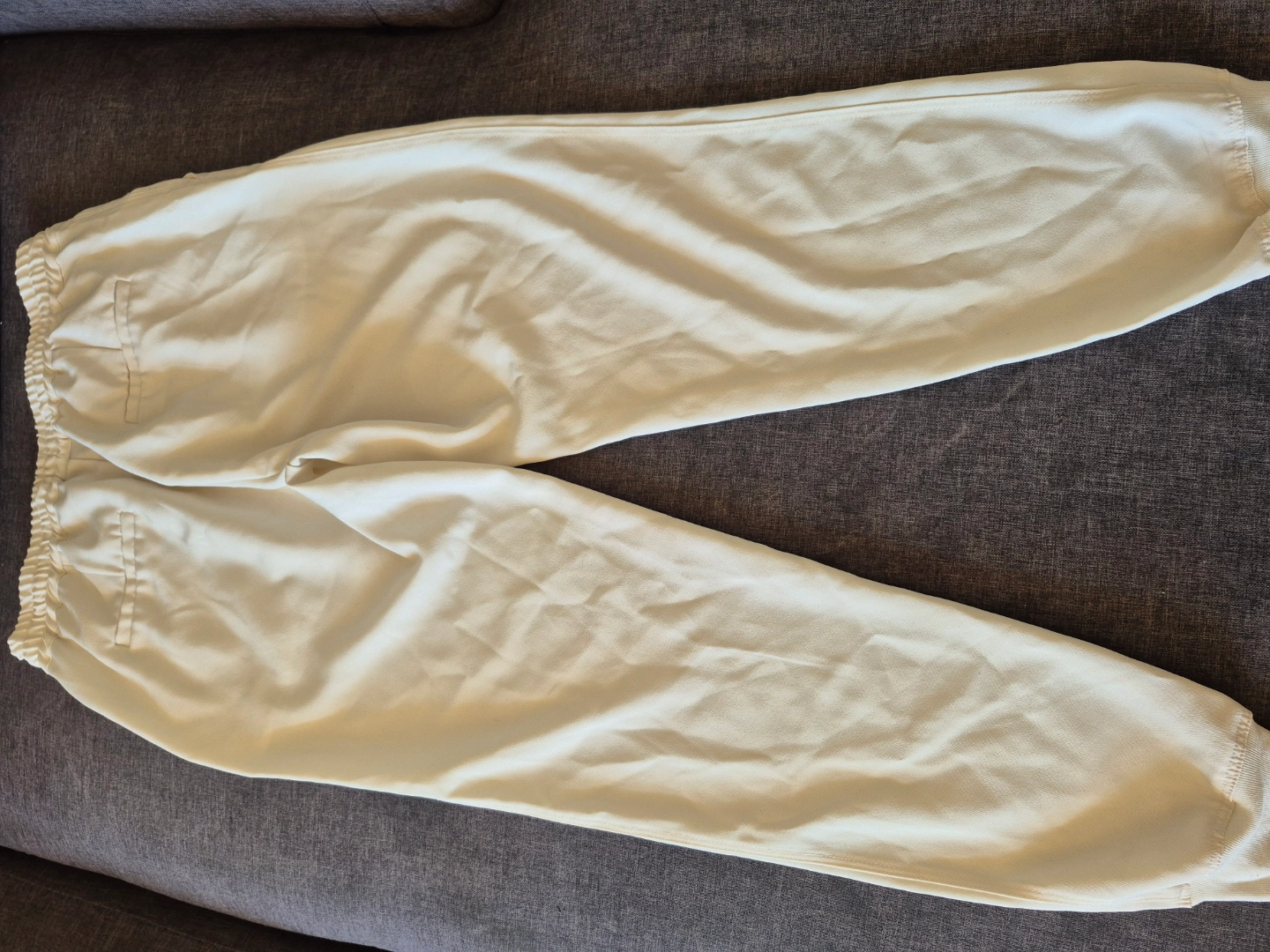 Cream-coloured joggers. Elastic waistband with drawstring. Two pockets. Cuffed ankles. Premium fleece material.