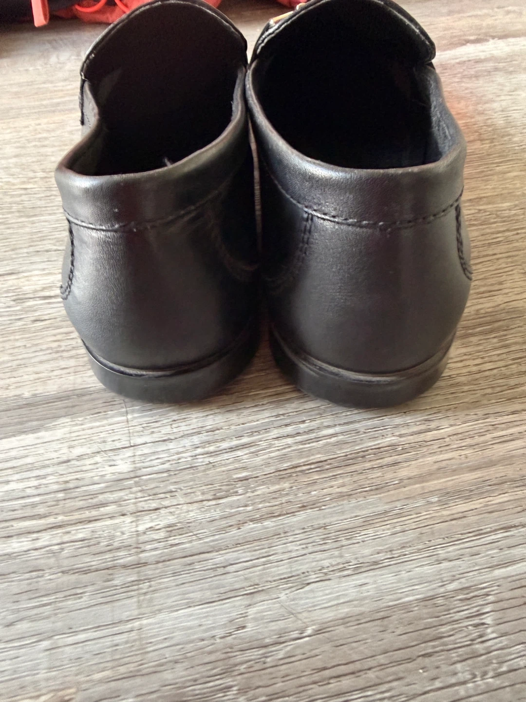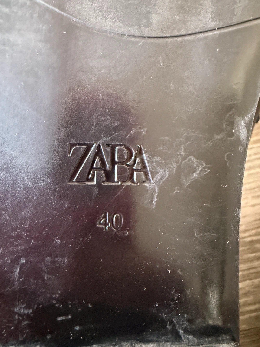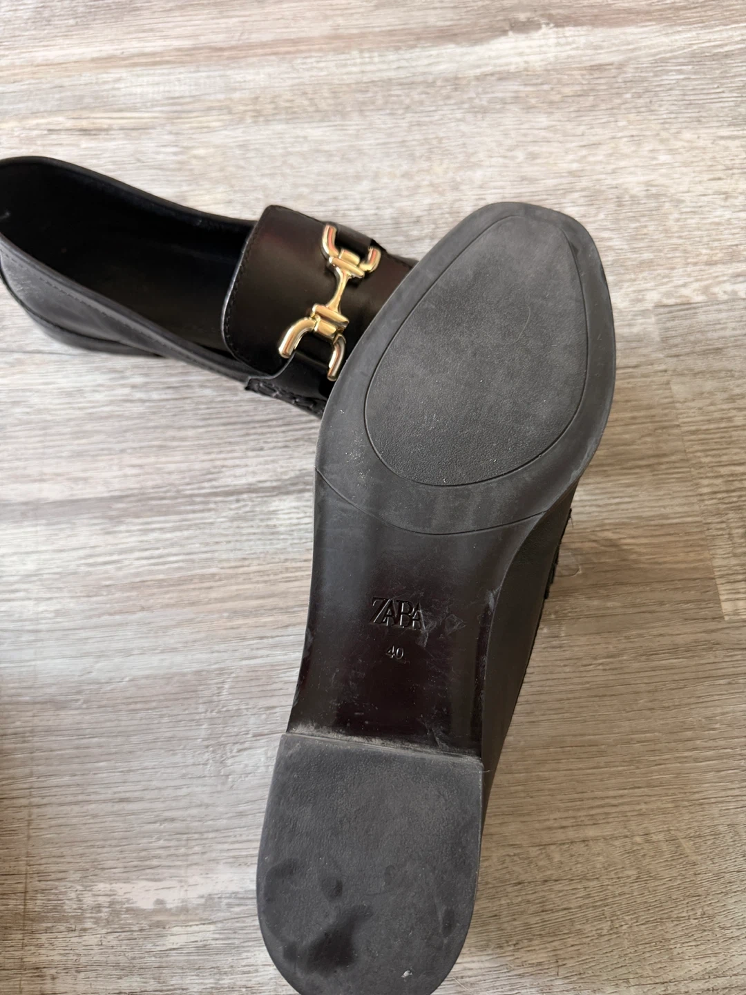Stylish black loafers from ZARA. These shoes are a size 40. They're a classic loafer style with a gold buckle