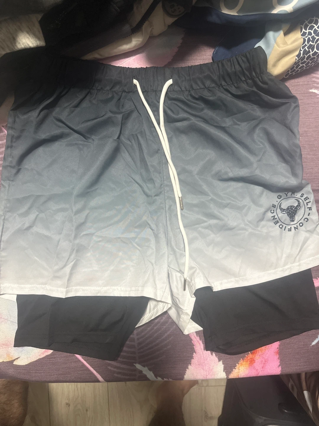 These men's athletic shorts feature a gradient design and a built-in compression layer. They have an elastic waistband with a drawstring for a secure fit. The outer shorts are made of lightweight material, perfect for workouts.