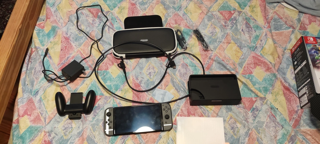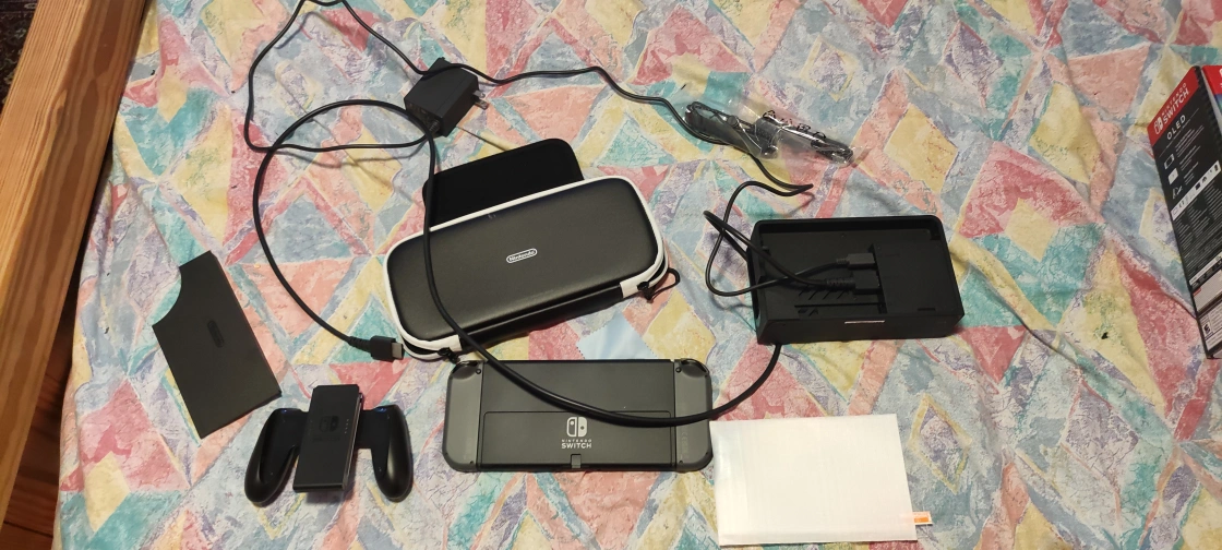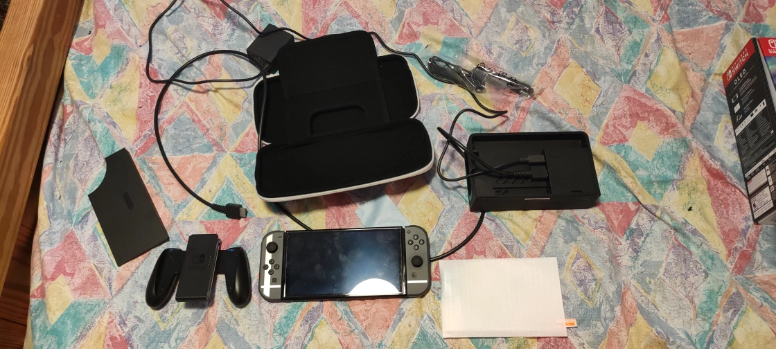 Plastic screen protector and glass screen protector already applied. Has HDMI cable, AC adapter, dock, joy con straps, and joy con grip. Includes free case, and free glass screen protector. Console used for only 3 weeks. Does not include any games.