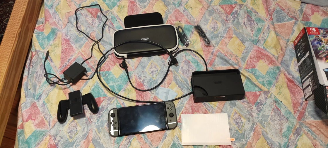 Plastic screen protector and glass screen protector already applied. Has HDMI cable, AC adapter, dock, joy con straps, and joy con grip. Includes free case, and free glass screen protector. Console used for only 3 weeks. Does not include any games.