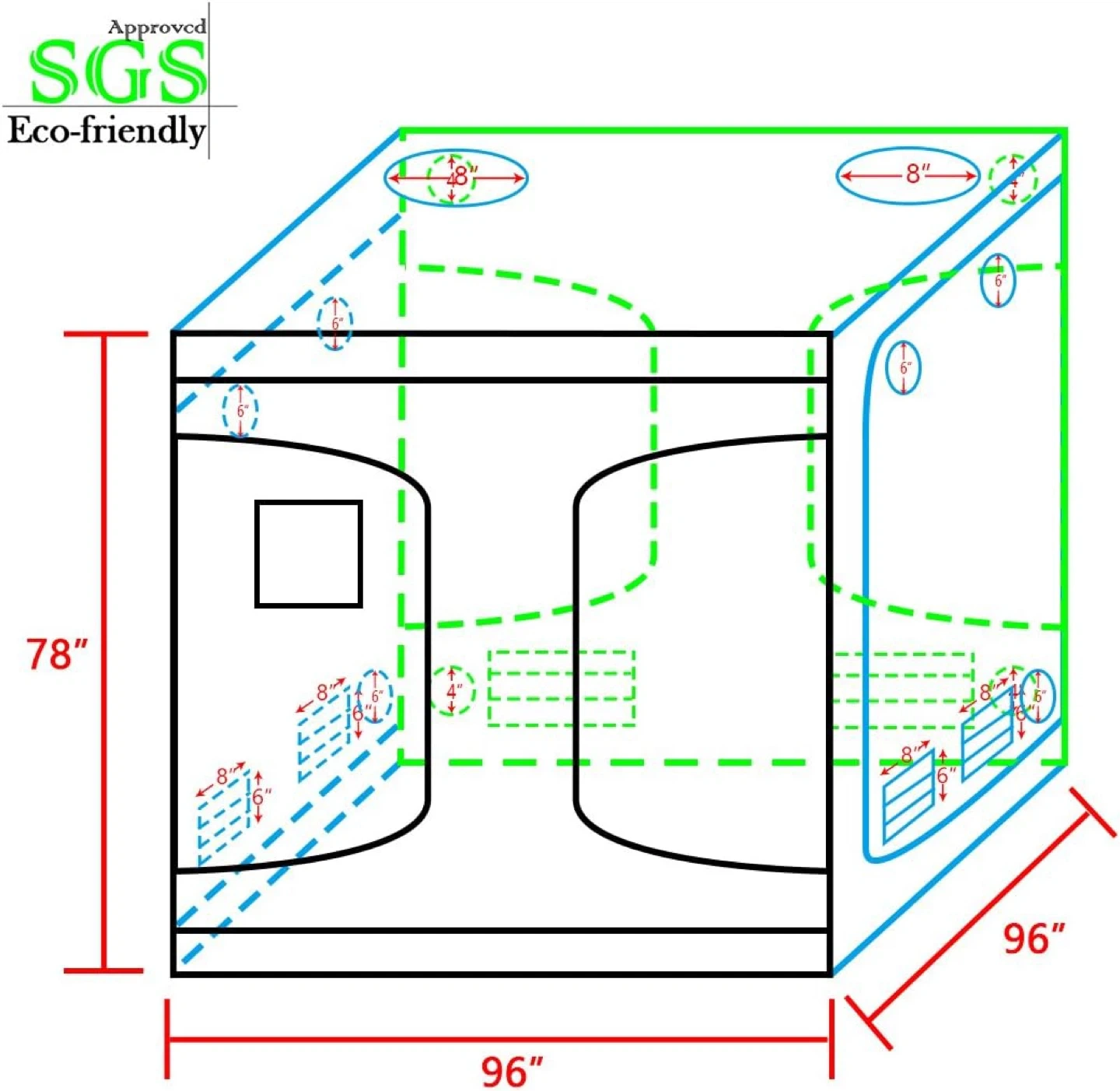 This Quictent grow tent measures 96"x96"x78". It's constructed with SGS Approved fabric, featuring a 100% reflective PET Silver Mylar interior and extra-thick 600D Oxford Cloth exterior. It's waterproof, lightproof, and eco-friendly. It includes dual ventilation socks, a mesh window, and a heavy-duty waterproof zipper. The frame is made of strong steel connectors.