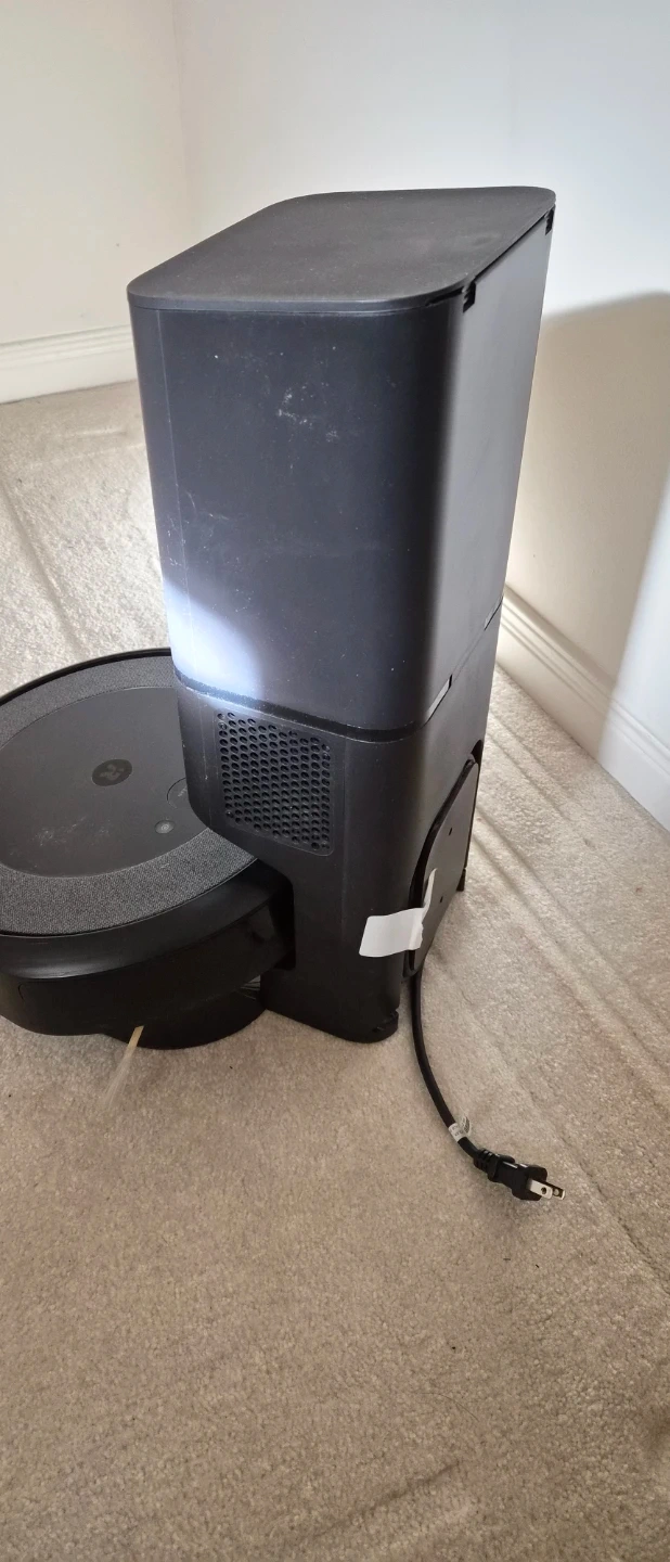 This iRobot Roomba robot vacuum is designed for automatic cleaning. It comes with a Clean Base for automatic dirt disposal. The unit is black and includes its charging station and power cord.