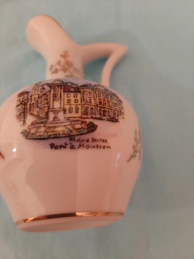 Selling a Vintage Mini Porcelain Pitcher. It features a detailed illustration of Pont a Mousson. The pitcher is in good condition and has gold trim.