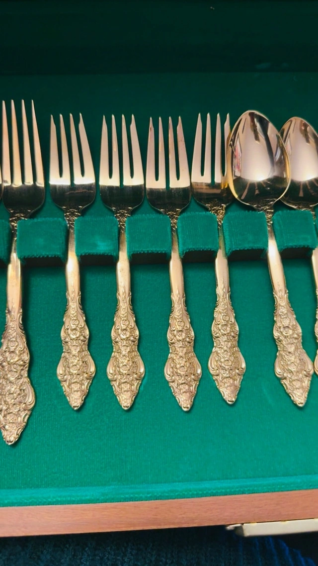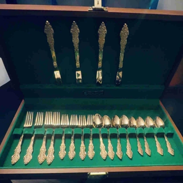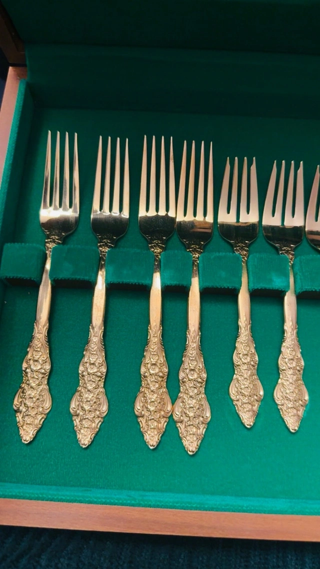 This is a new F. B. Rogers and Sons, French Rose, 20-piece gold-plated flatware set, complete with its original wooden case and green felt interior. This elegant set includes dinner forks, salad forks, dinner spoons, teaspoons, and knives, each piece adorned with the intricate French Rose pattern and finished in a luxurious gold plate. Brand: F. B. Rogers and Sons, Pattern: French Rose, Material: Gold Plated, Number of Pieces: 20. This flatware set adds a touch of vintage glamour to any dining experience. If you've been searching for a unique piece to elevate your table setting, look no further! The ad is still up, so it's still available.
