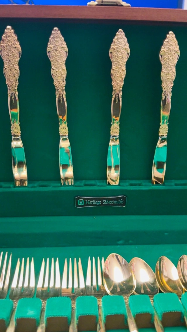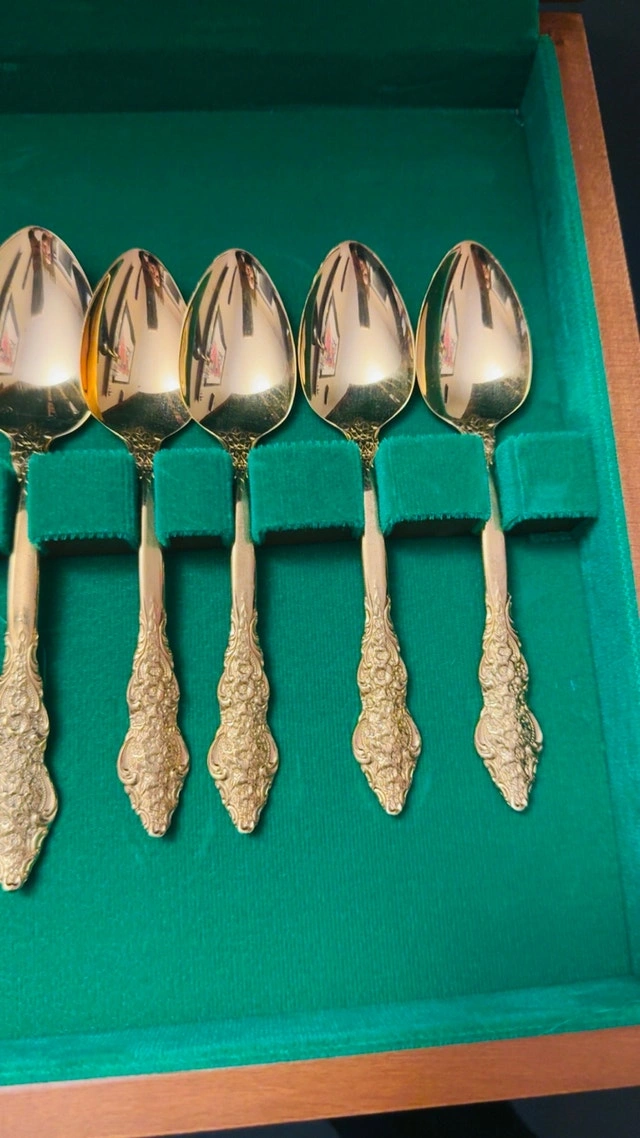 This is a new F. B. Rogers and Sons, French Rose, 20-piece gold-plated flatware set, complete with its original wooden case and green felt interior. This elegant set includes dinner forks, salad forks, dinner spoons, teaspoons, and knives, each piece adorned with the intricate French Rose pattern and finished in a luxurious gold plate. Brand: F. B. Rogers and Sons, Pattern: French Rose, Material: Gold Plated, Number of Pieces: 20. This flatware set adds a touch of vintage glamour to any dining experience. If you've been searching for a unique piece to elevate your table setting, look no further! The ad is still up, so it's still available.