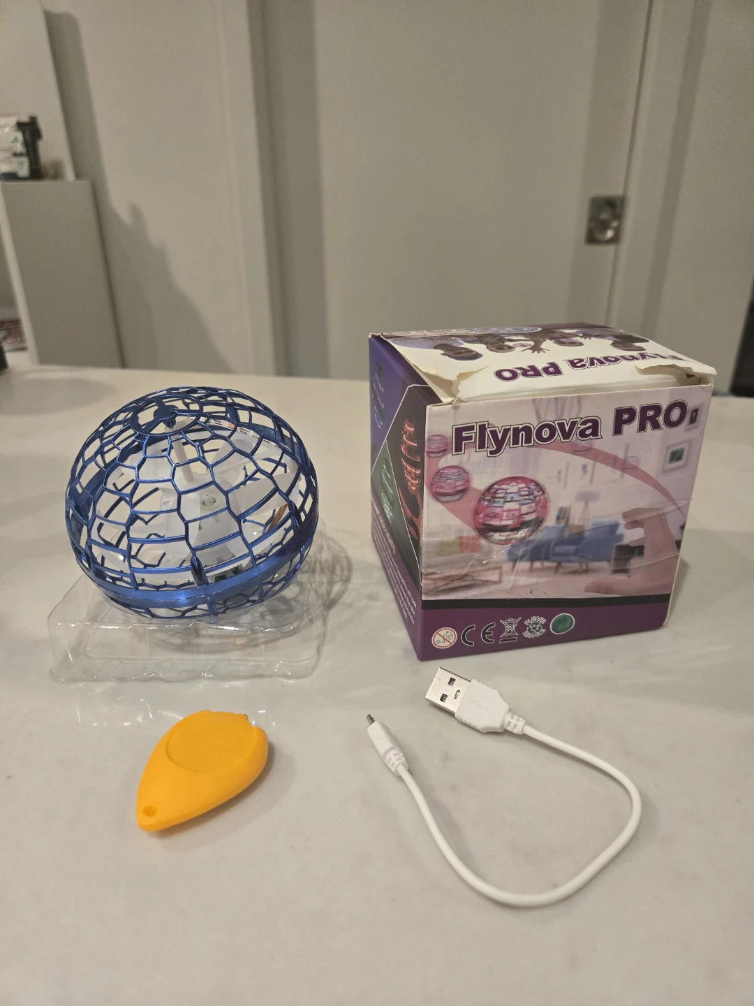 Selling a Flynova PRO flying spinner drone! It comes with the original box, charger, and remote. It's in great condition and ready for some fun!