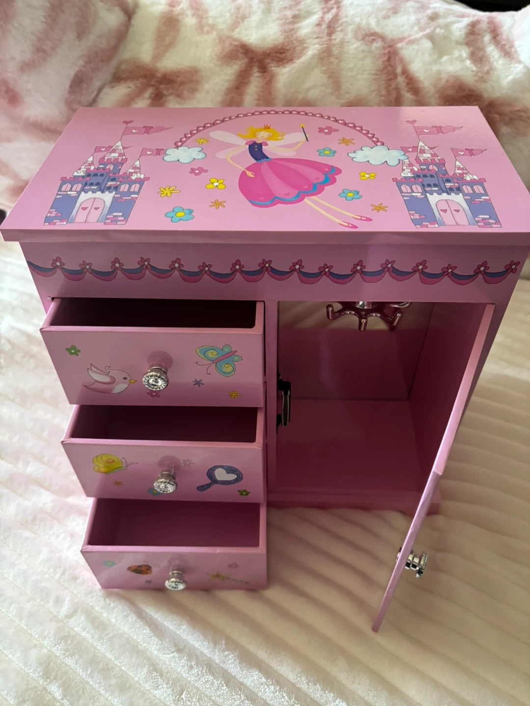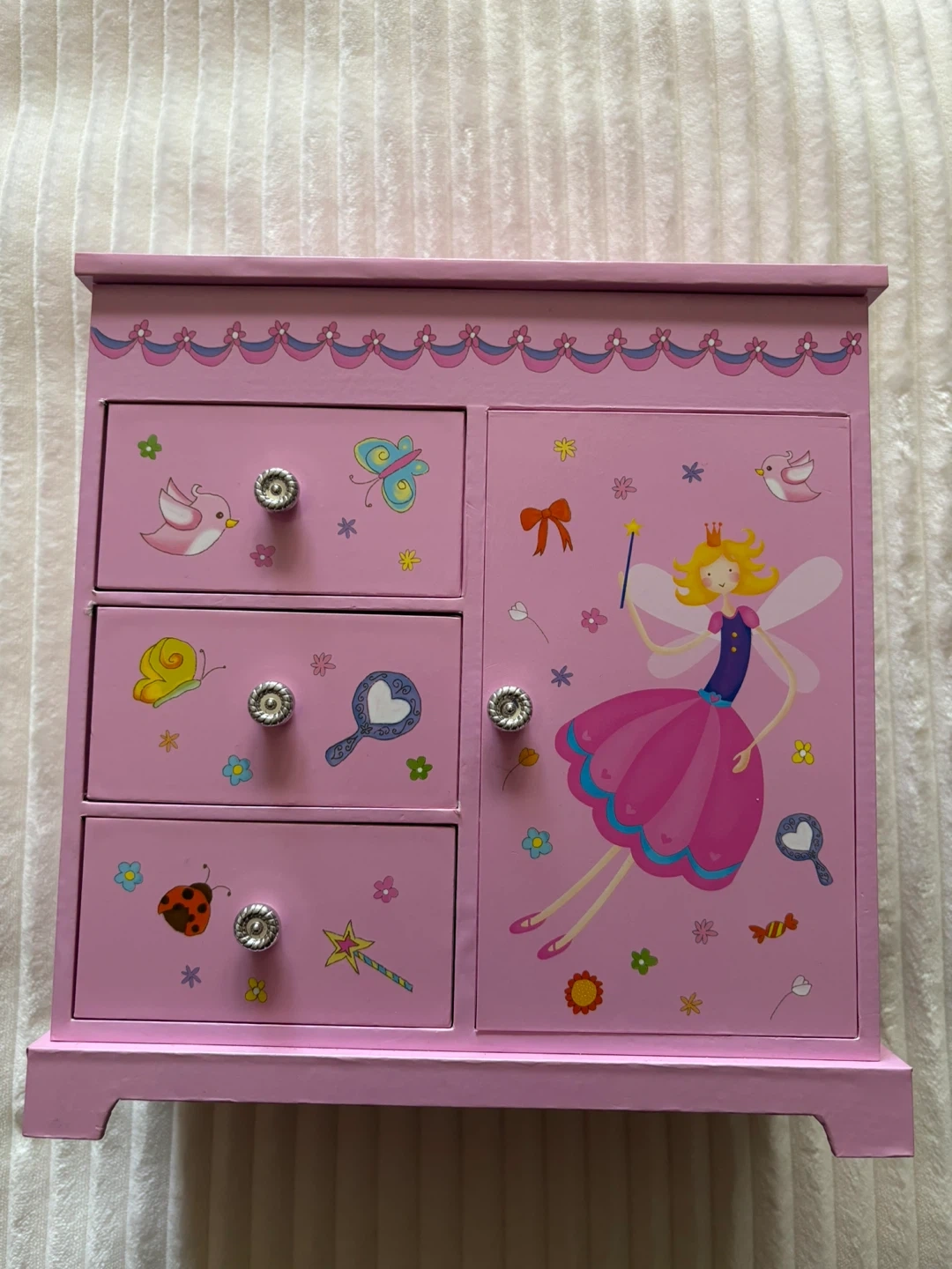 This pink jewellery box features a charming fairy design with three drawers and a side cabinet. It includes a small mirror on top for convenience. Perfect for storing trinkets and treasures!