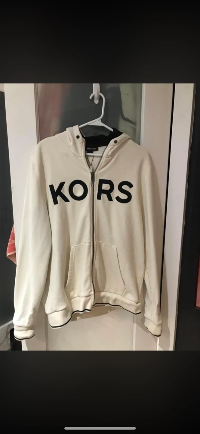 Cream coloured zip-up hoodie by Michael Kors. Features large black "KORS" lettering on the front and black trim along the edges. Has a full zip closure and front pockets. Made from a comfortable material.