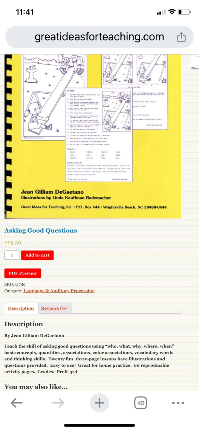 Educational book teaching children to ask good questions. Uses "who, what, why, where, when". Includes colour associations, vocabulary words, basic concepts, quantities. Easy to use! Great for home practice. 60 reproducible activity pages. Grades PreK-3rd.