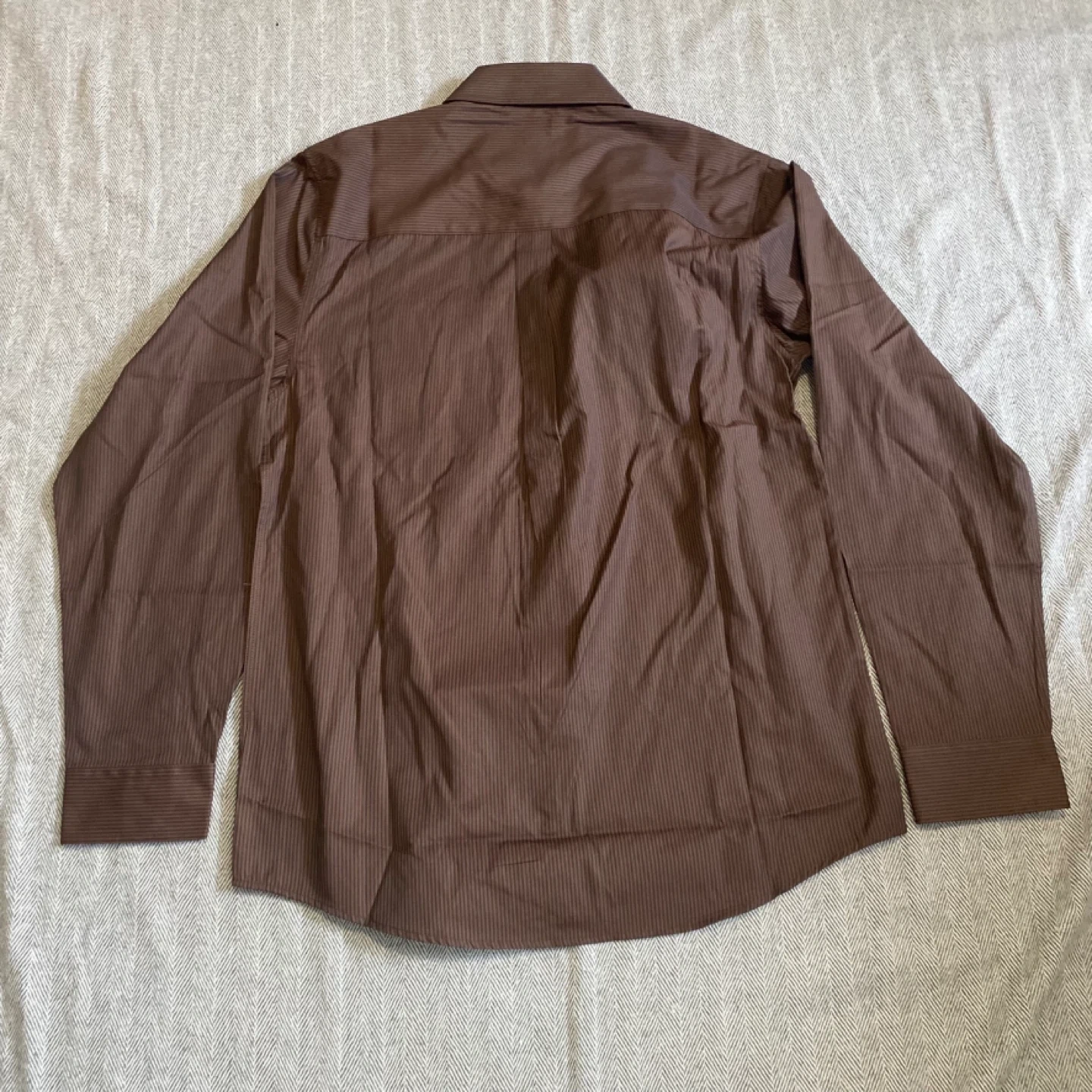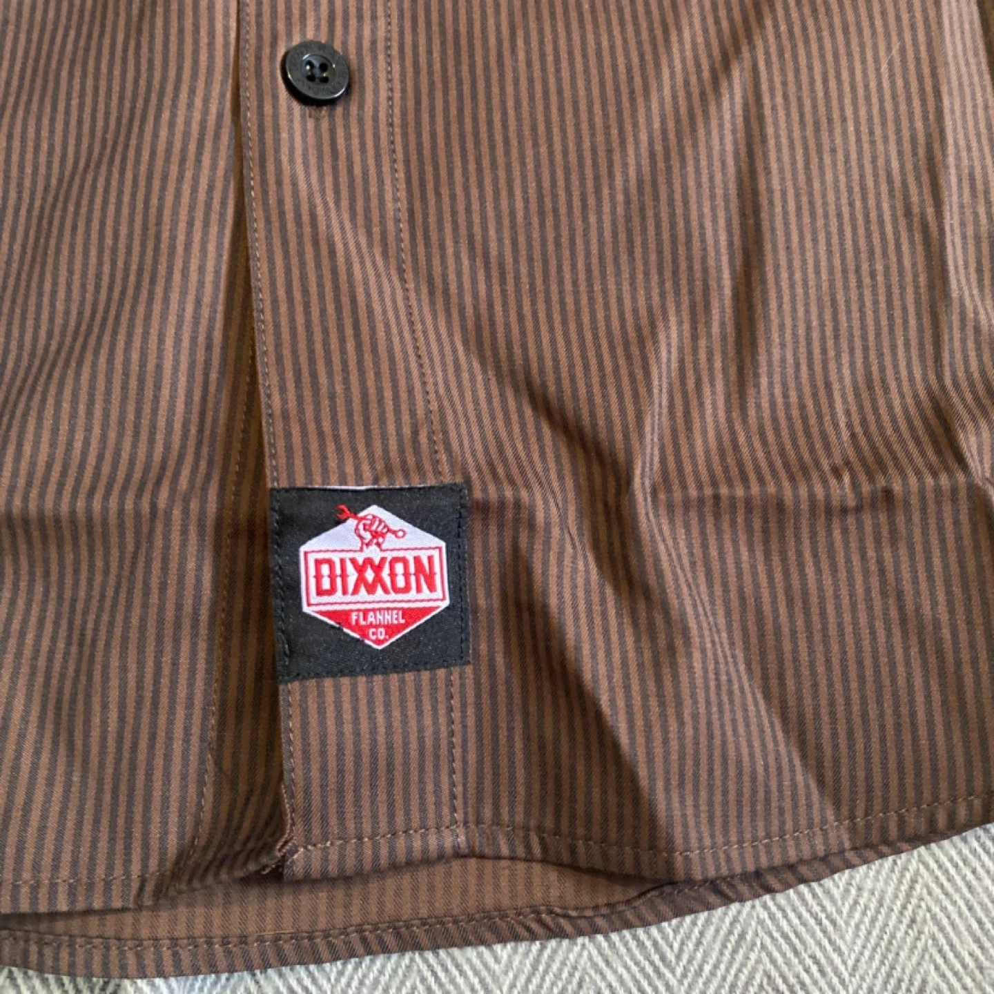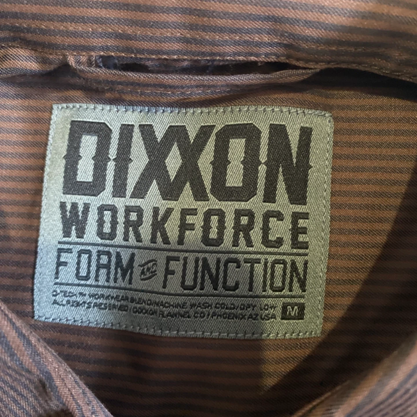This is a NWT DIXXON WORKFORCE long sleeve button up shirt. It's a brown pinstripe design with two front chest pockets and black buttons. The material is a blend, suitable for work or casual wear.