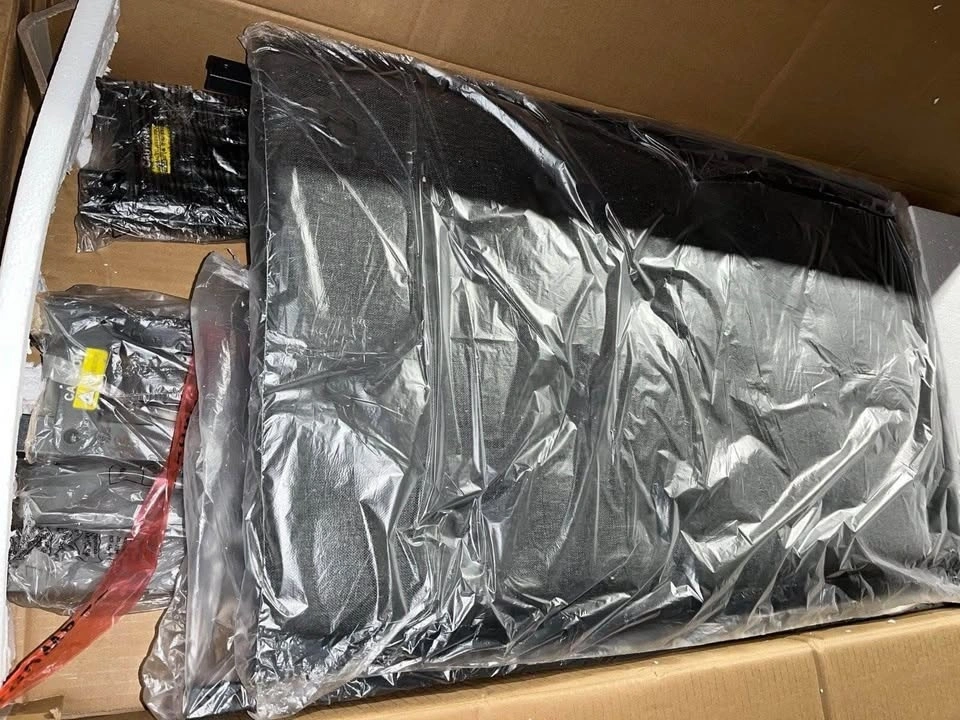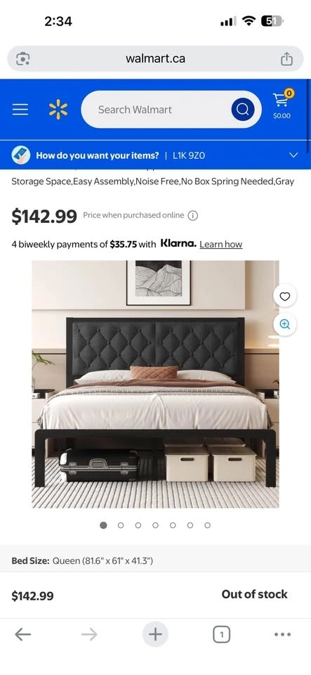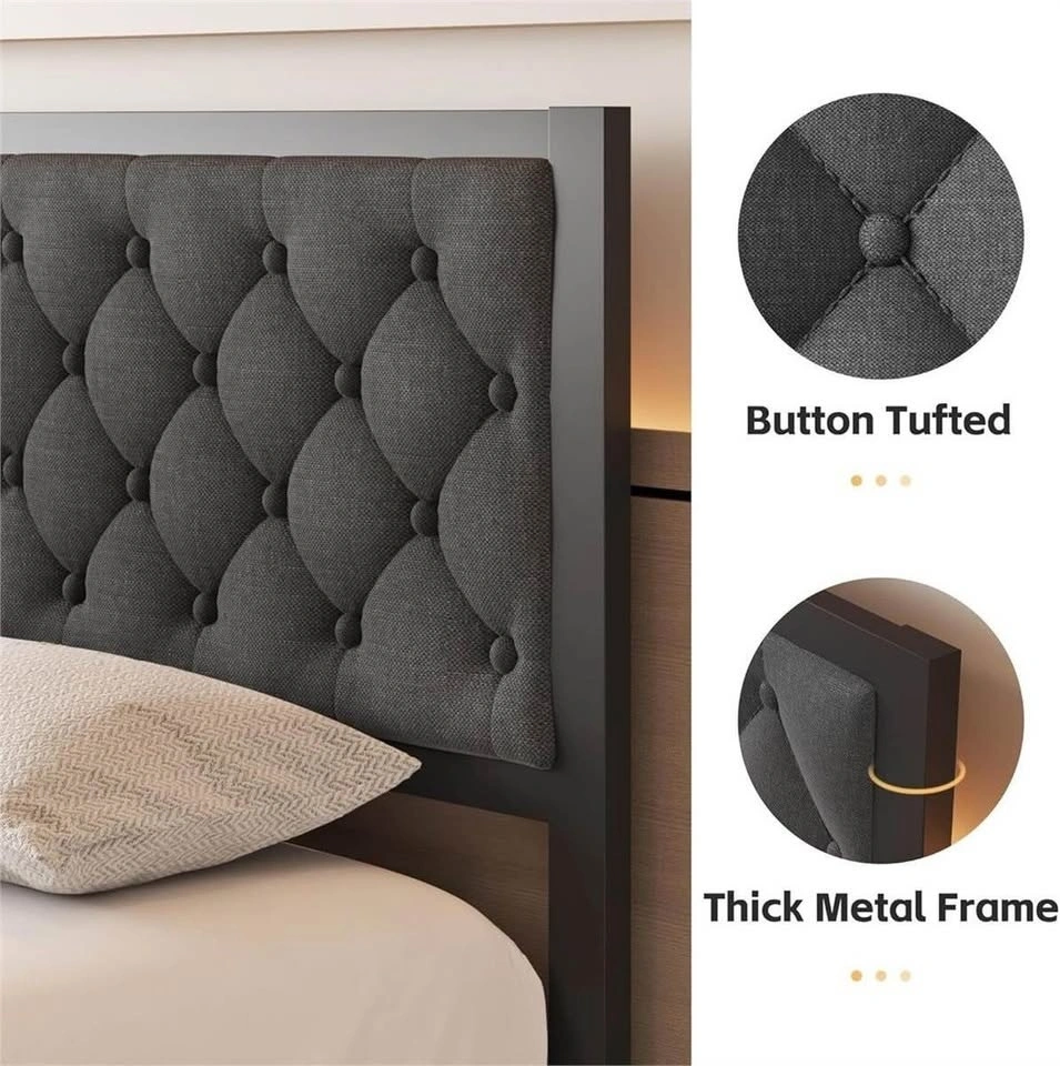 New Queen bed frame. Grey linen upholstered headboard with button tufting. Thick metal frame and all metal slat platform, super sturdy. No box spring needed! Has 12.6-inch under-bed storage space, great for keeping things tidy. Easy assembly, all parts in one box with instructions. Designed to be noise-free too, so no squeaks while you sleep. Bed frame height 41.3", upholstered section 17.7".