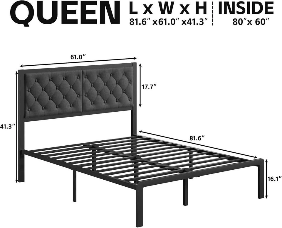 New Queen bed frame. Grey linen upholstered headboard with button tufting. Thick metal frame and all metal slat platform, super sturdy. No box spring needed! Has 12.6-inch under-bed storage space, great for keeping things tidy. Easy assembly, all parts in one box with instructions. Designed to be noise-free too, so no squeaks while you sleep. Bed frame height 41.3", upholstered section 17.7".