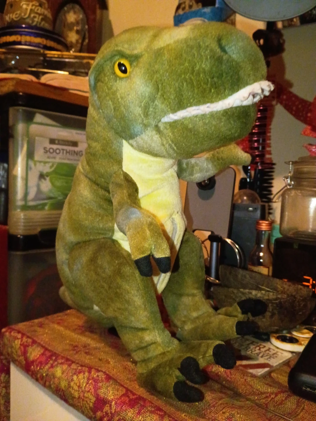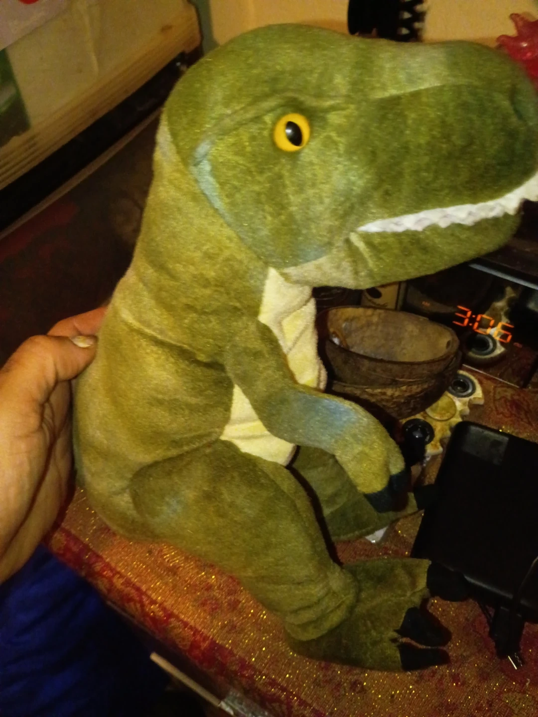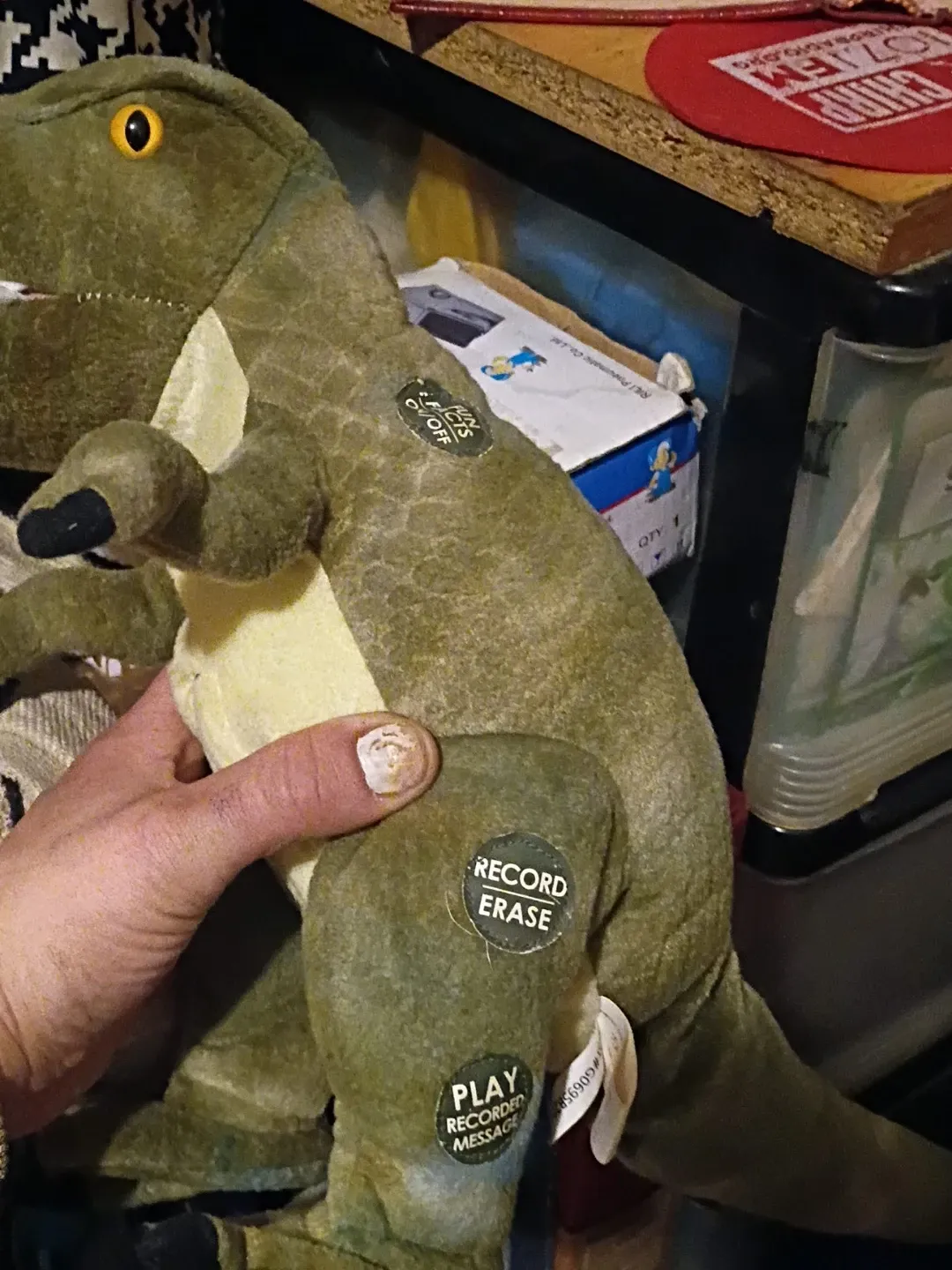 This plush dinosaur toy is ready for a new home! It features record and erase functions, as well as a play recorded message option. Perfect for kids who love dinosaurs and interactive play