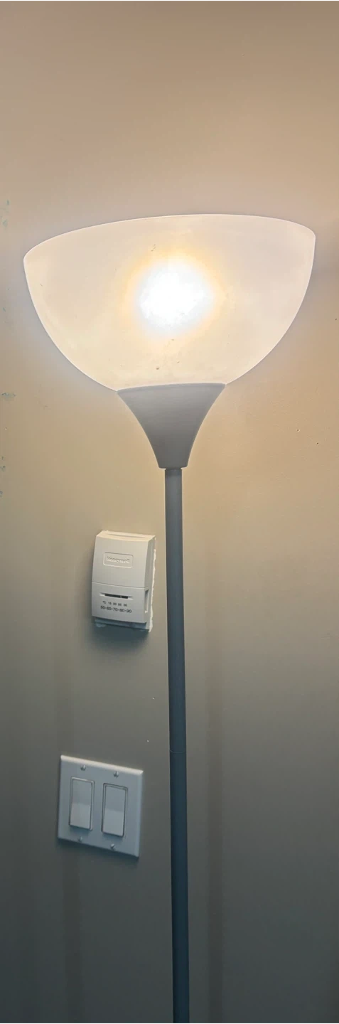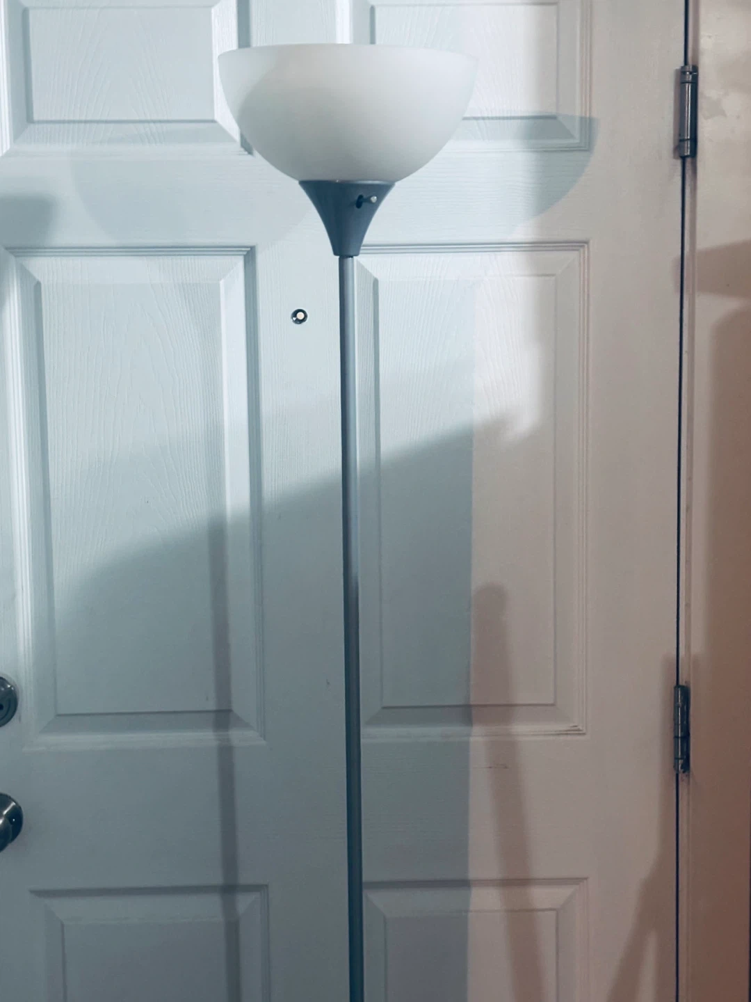 This is a grey floor lamp with a frosted white shade. It has a sturdy round base and a slim metal pole. It's perfect for adding ambient lighting to any room. Pick up in Terwillegar