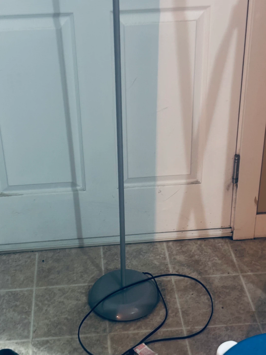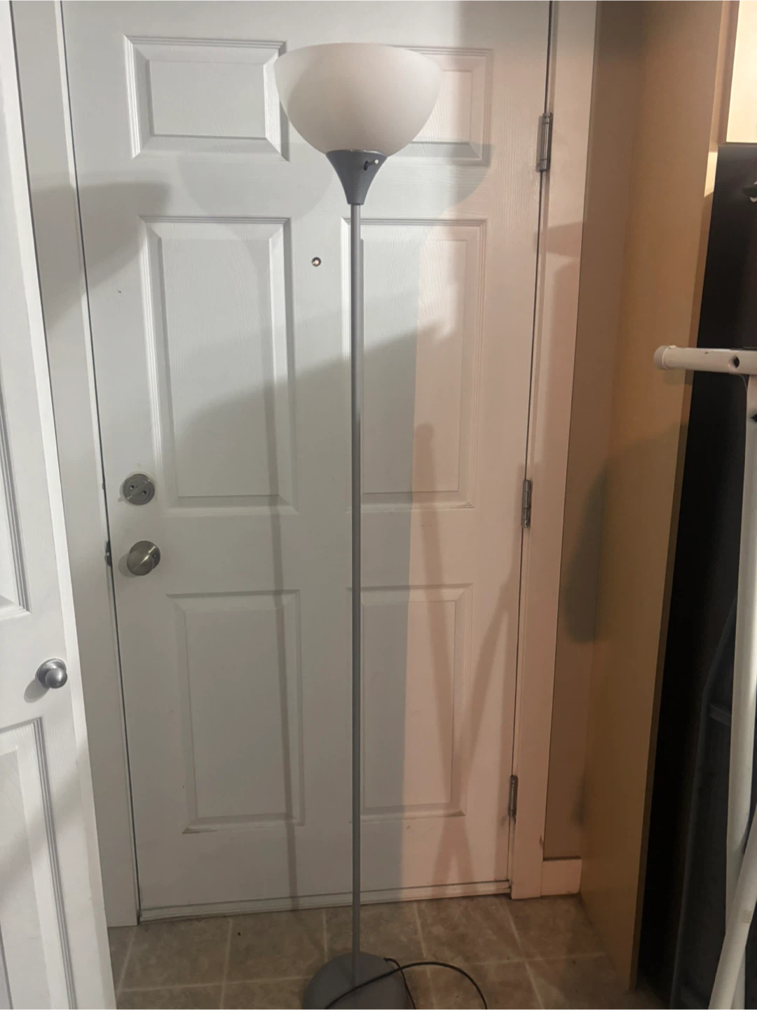 This is a grey floor lamp with a frosted white shade. It has a sturdy round base and a slim metal pole. It's perfect for adding ambient lighting to any room. Pick up in Terwillegar