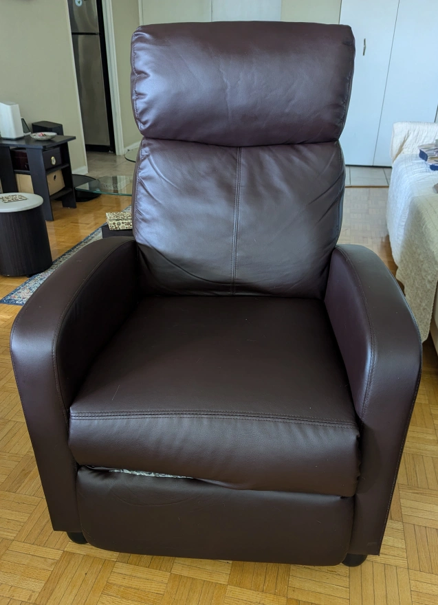 Brown leather recliner with footrest. The chair is in good condition but has some minor wear and tear. It is a very comfortable and functional chair. The chair is also fairly heavy. Buyer must be able to pick it up and transport. Please contact me if you have any questions. Pick up only.