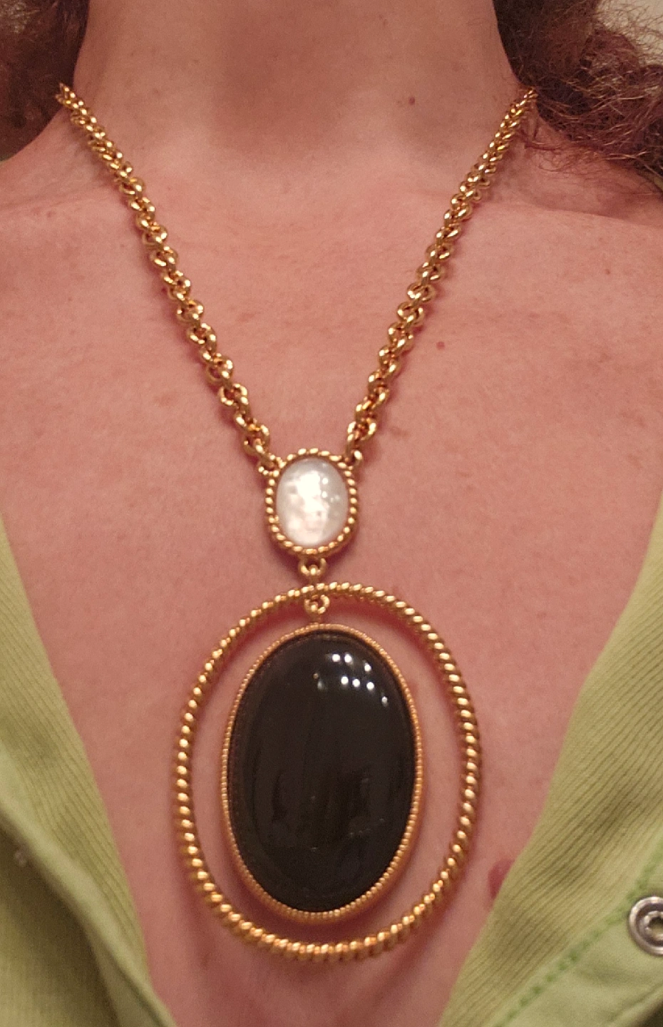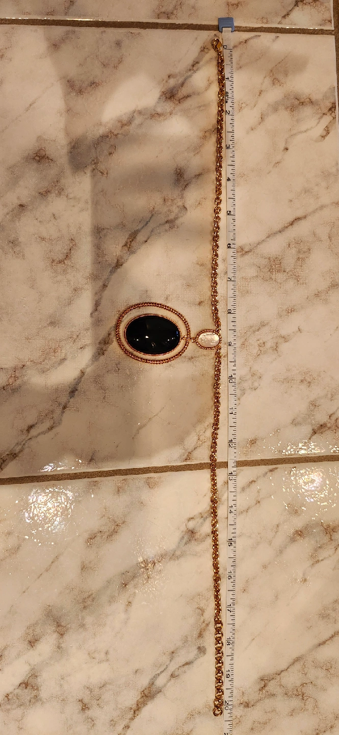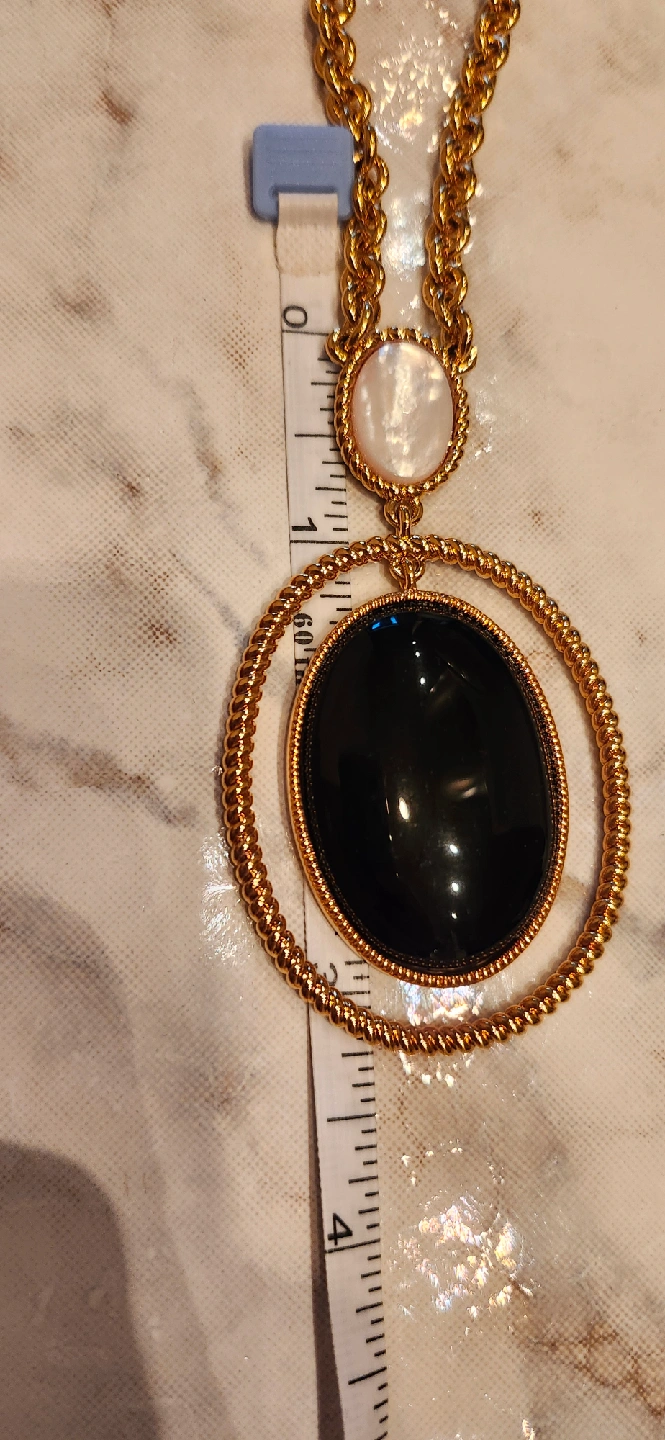 Selling a beautiful Joan Rivers Classics Collection pendant necklace. It features a gold-tone chain and a pendant with a black stone surrounded by a gold ring, topped with a smaller white mother of pearl stone. The chain measures approximately 20 inches in length, and the pendant is 3.25 inches long and a lobster claw clasp. Comes in its original box. A classic piece to add to your collection!