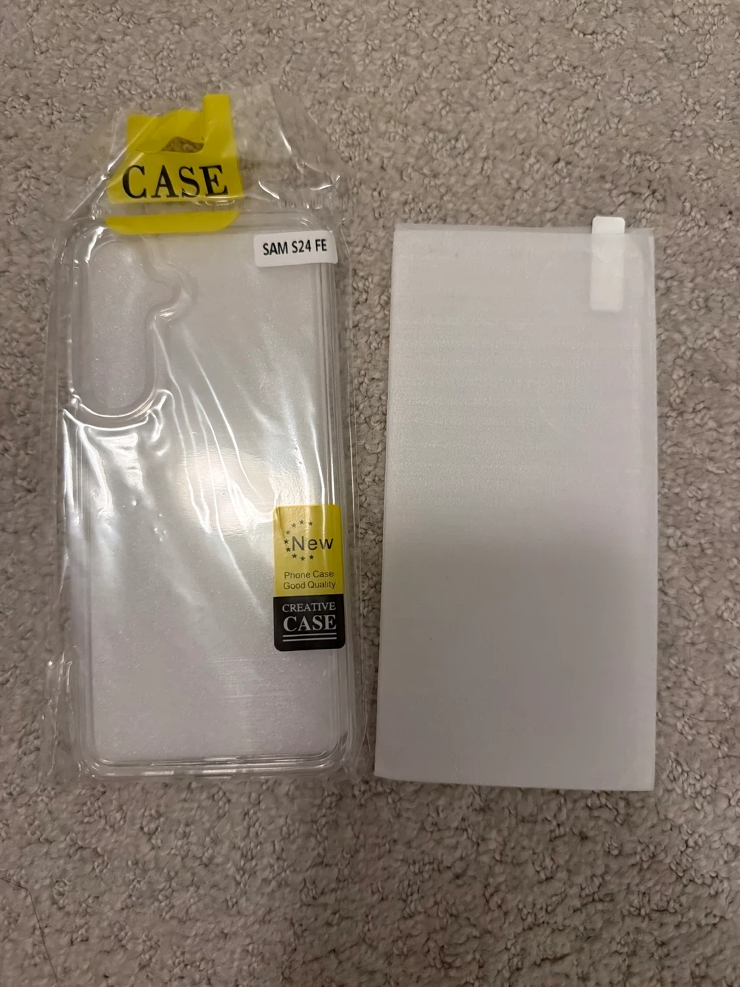 Selling a Samsung Galaxy S24 FE phone in Graphite with 128GB of storage. It's in the original box and includes a clear phone case and a screen protector. Manufactured in Vietnam.